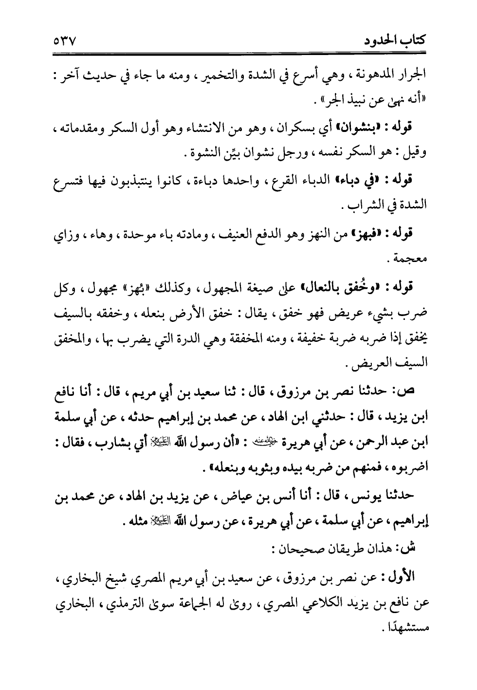 ص: حدثنا نصر بن مرزوق، قال: ثنا سعيد بن أبي مريم، قال: أنا نافع ابن يزيد، قال: حدثني ابن الهاد، عن محمَّد بن إبراهيم حدثه، عن أبي سلمة ابن عبد الرحمن، عن أبي هريرة - رضي الله عنه -: "أن رسول الله -عليه السلام- أتي بشارب، فقال: اضربوه، فمنهم من ضربه بيده وبثوبه وبنعله".