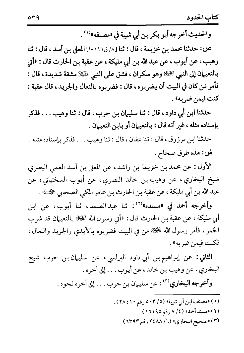 ص: حدثنا محمَّد بن خزيمة، قال: ثنا المعلى بن أسد، قال: ثنا وهيب، عن أيوب، عن عبد الله بن أبي مليكة، عن عقبة بن الحارث قال: "أتي بالنعيمان إلى النبي -عليه السلام- وهو سكران، فشق على النبي -عليه السلام- مشقة شديدة، قال: فأمر مَن كان في البيت أن يضربوه، قال: فضربوه بالنعال والجريد، قال عقبة: كنت فيمن ضربه".