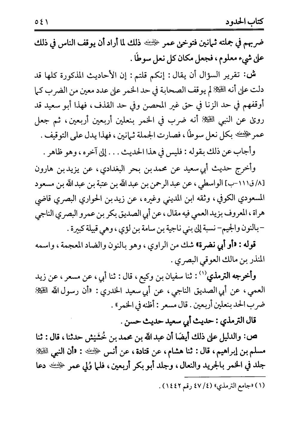 وأخرجه الترمذي (¬1): ثنا سفيان بن وكيع، قال: ثنا أبي، عن مسعر، عن زيد العمي، عن أبي الصديق الناجي، عن أبي سعيد الخدري: "أن رسول الله -عليه السلام- ضرب الحد بنعلين أربعين. قال مسعر: أظنه في الخمر".