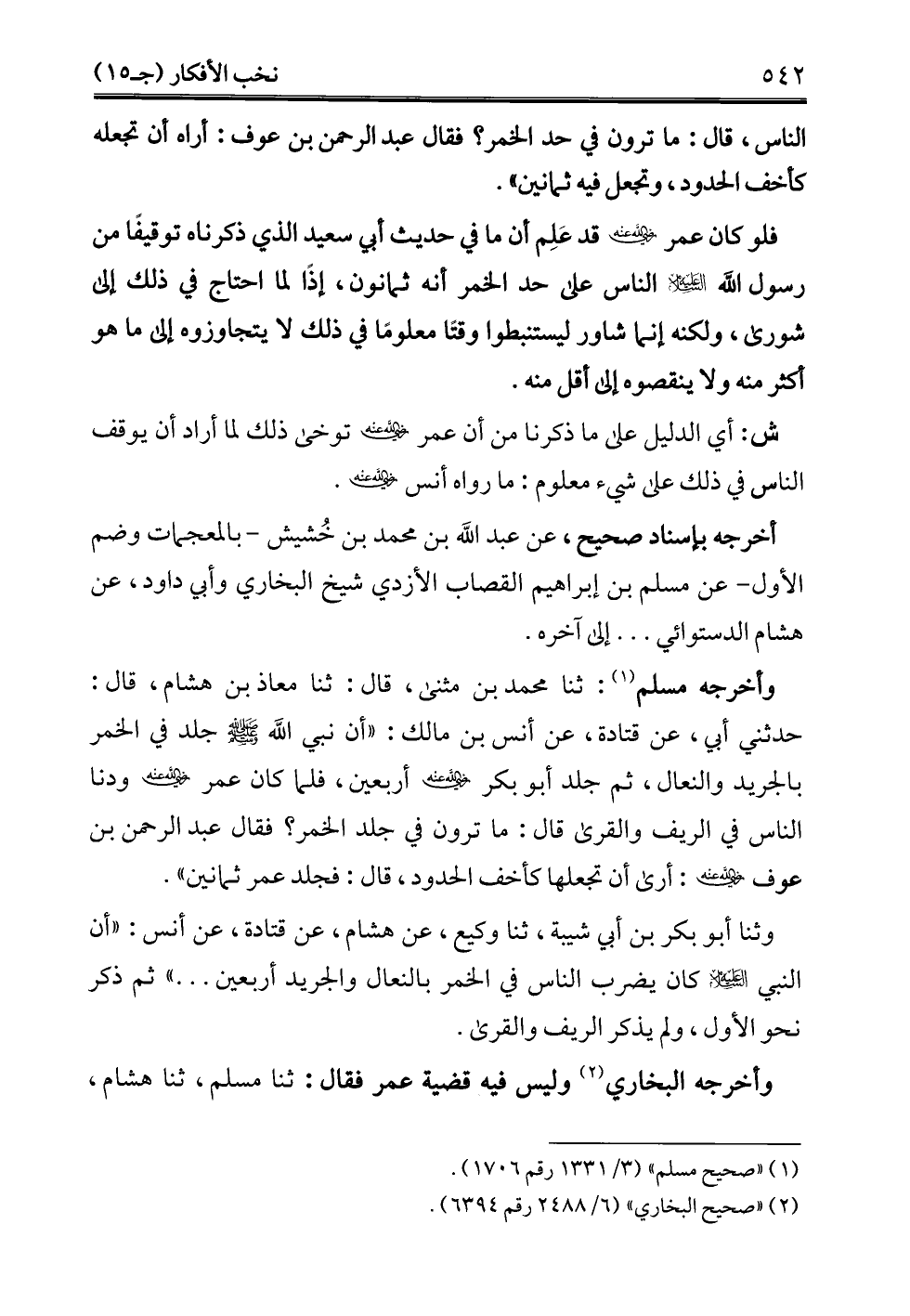 فلو كان عمر - رضي الله عنه - قد عَلِم أن ما في حديث أبي سعيد الذي ذكرناه توقيفًا من رسول الله -عليه السلام- الناس على حد الخمر أنه ثمانون، إذًا لما احتاج في ذلك إلى شورى، ولكنه إنما شاور ليستنبطوا وقتًا معلومًا في ذلك لا يتجاوزوه إلى ما هو أكثر منه ولا ينقصوه إلى أقل منه.