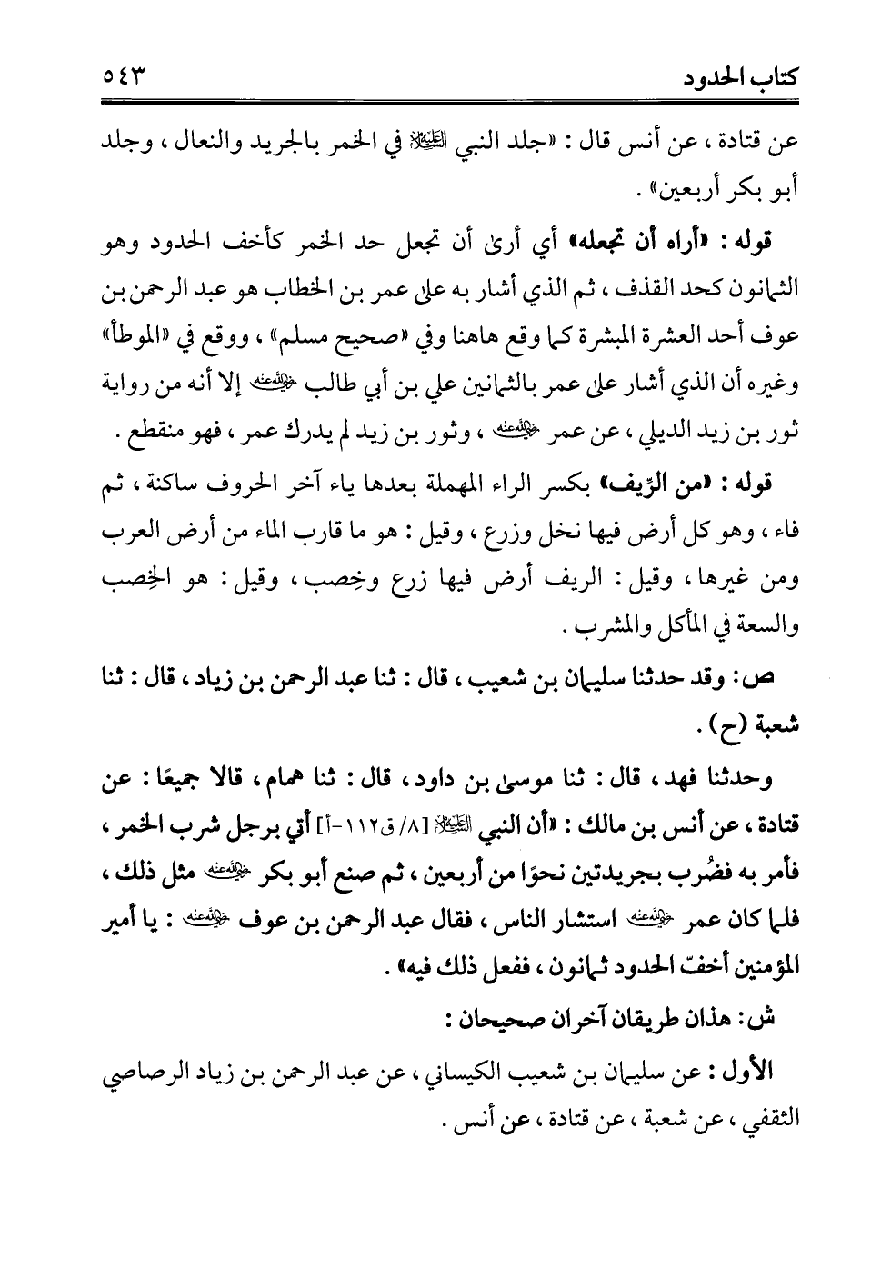 وحدثنا فهد، قال: ثنا موسى بن داود، قال: ثنا همام، قالا جميعًا: عن قتادة، عن أنس بن مالك: "أن النبي -عليه السلام- أتي برجل شرب الخمر، فأمر به فضُرب بجريدتين نحوًا من أربعين، ثم صنع أبو بكر - رضي الله عنه - مثل ذلك، فلما كان عمر - رضي الله عنه - استشار النَّاس، فقال عبد الرحمن بن عوف - رضي الله عنه -: يا أمير المؤمنين أخفّ الحدود ثمانون، ففعل ذلك فيه".