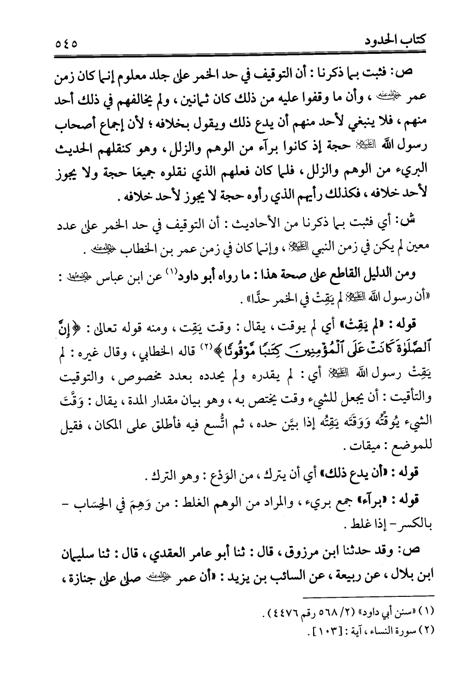 ومن الدليل القاطع على صحة هذا: ما رواه أبو داود (¬1) عن ابن عباس - رضي الله عنهما -: "أن رسول الله -عليه السلام- لم يَقِتْ في الخمر حدًّا".