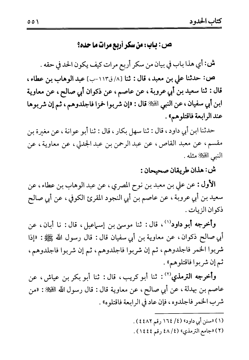 ص: حدثنا علي بن معبد، قال: ثنا عبد الوهاب بن عطاء، قال: ثنا سعيد بن أبي عروبة، عن عاصم، عن ذكوان أبي صالح، عن معاوية ابن أبي سفيان، عن النبي -عليه السلام- قال: "إن شربوا خمرًا فاجلدوهم، ثم إن شربوها عند الرابعة فاقتلوهم".