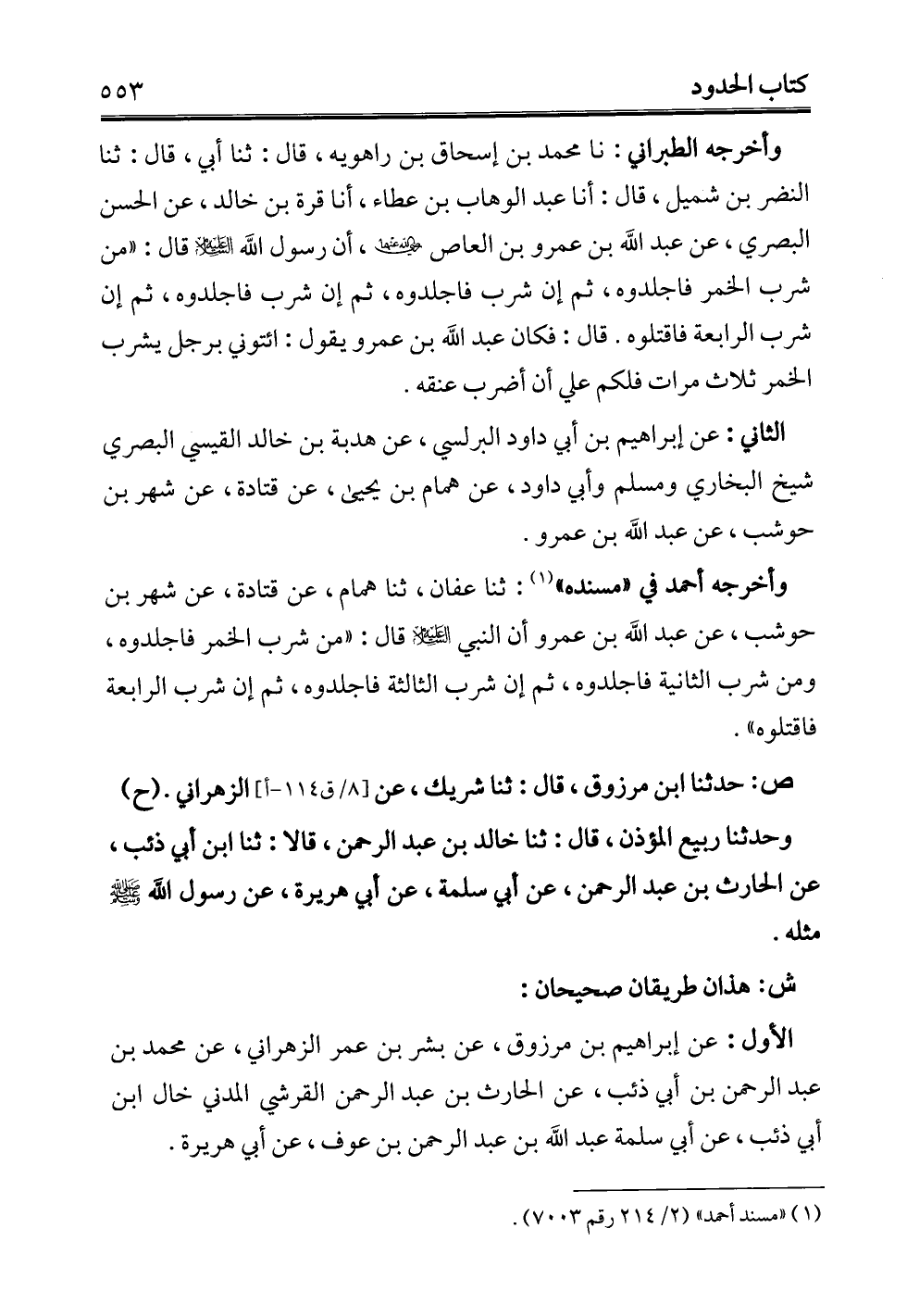 وأخرجه الطبراني: نا محمَّد بن إسحاق بن راهويه، قال: ثنا أبي، قال: ثنا النضر بن شميل، قال: أنا عبد الوهاب بن عطاء، أنا قرة بن خالد، عن الحسن البصري، عن عبد الله بن عمرو بن العاص - رضي الله عنهما -، أن رسول الله -عليه السلام- قال: "من شرب الخمر فاجلدوه، ثم إن شرب فاجلدوه، ثم إن شرب فاجلدوه، ثم إن شرب الرابعة فاقتلوه. قال: فكان عبد الله بن عمرو يقول: ائتوني برجل يشرب الخمر ثلاث مرات فلكم علي أن أضرب عنقه.