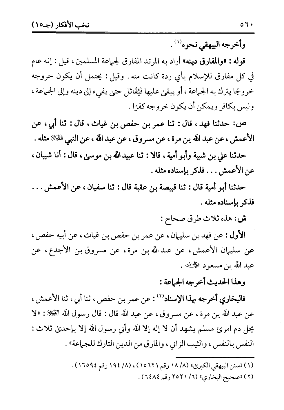 فالبخاري أخرجه بهذا الإسناد (¬2): عن عمر بن حفص، ثنا أبي، ثنا الأعمش، عن عبد الله بن مرة، عن مسروق، عن عبد الله قال: قال رسول الله -عليه السلام-: "لا يحل دم امرئ مسلم يشهد أن لا إله إلا الله وأني رسول الله إلا بإحدى ثلاث: النفس بالنفس، والثيب الزاني، والمارق من الدين التارك للجماعة".