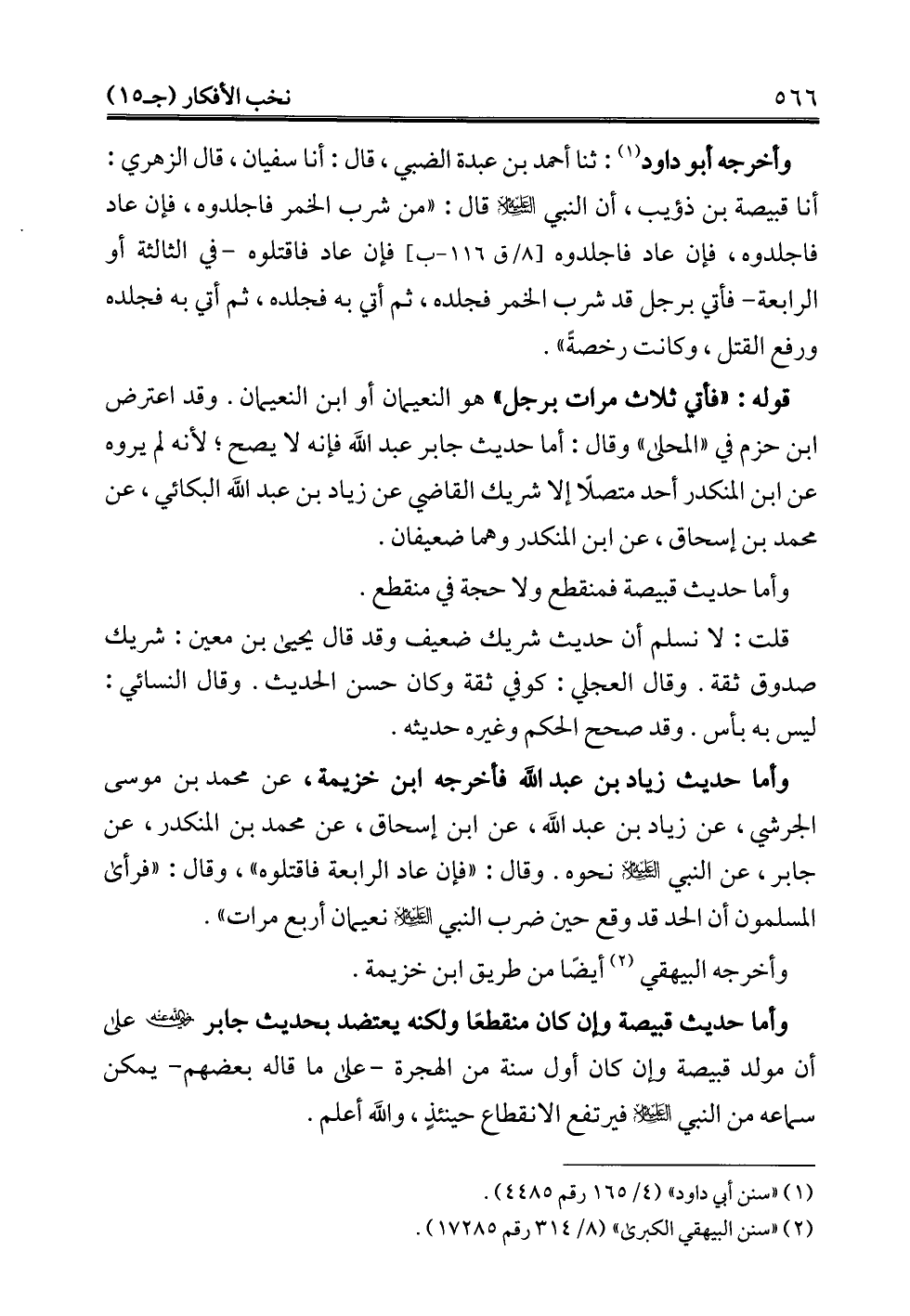 وأما حديث زياد بن عبد الله فأخرجه ابن خزيمة، عن محمد بن موسى الجرشي، عن زياد بن عبد الله، عن ابن إسحاق، عن محمد بن المنكدر، عن جابر، عن النبي -عليه السلام- نحوه. وقال: "فإن عاد الرابعة فاقتلوه"، وقال: "فرأى المسلمون أن الحد قد وقع حين ضرب النبي -عليه السلام- نعيمان أربع مرات".