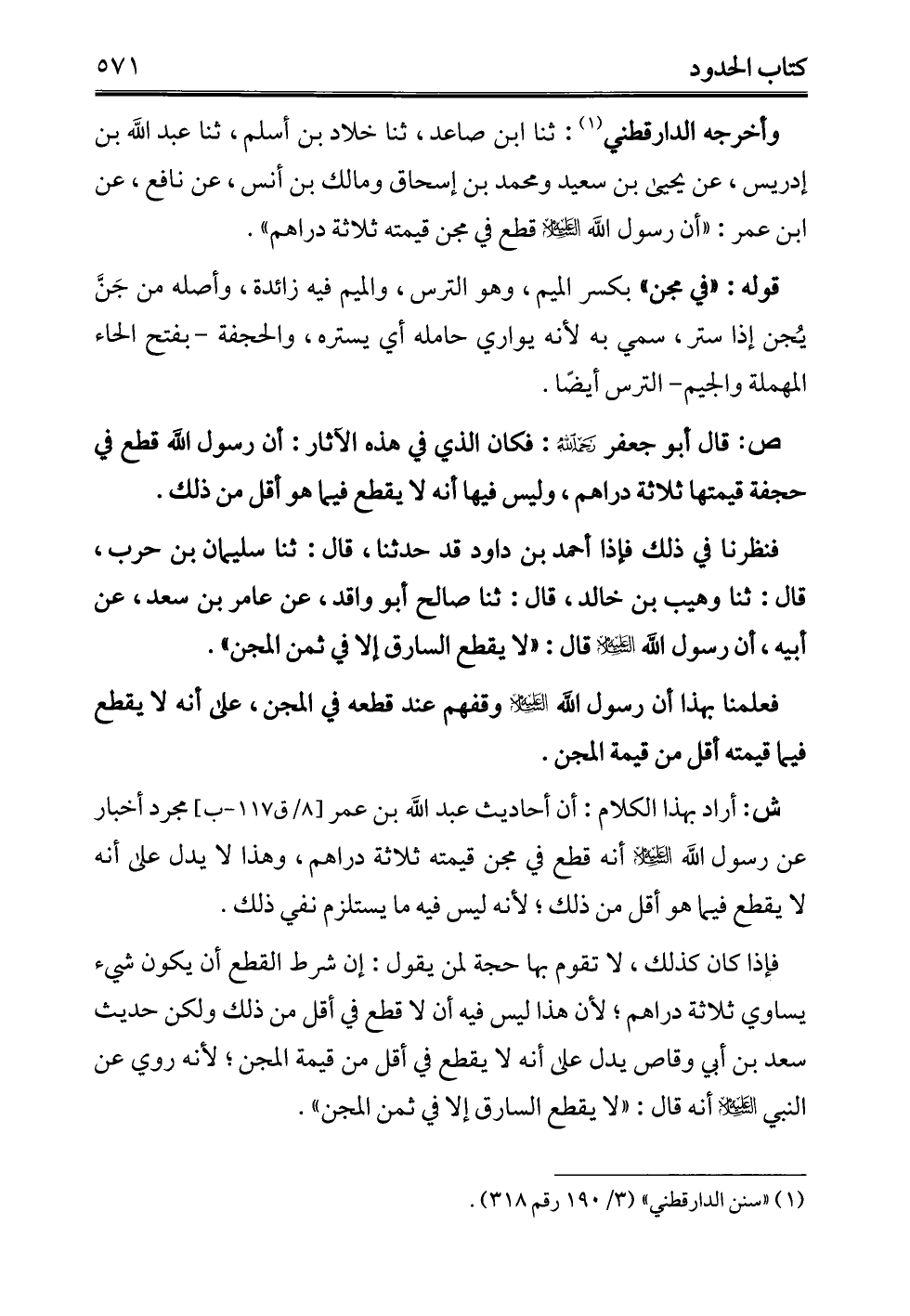 فعلمنا بهذا أن رسول الله -عليه السلام- وقفهم عند قطعه في المجن، على أنه لا يقطع فيما قيمته أقل من قيمة المجن.