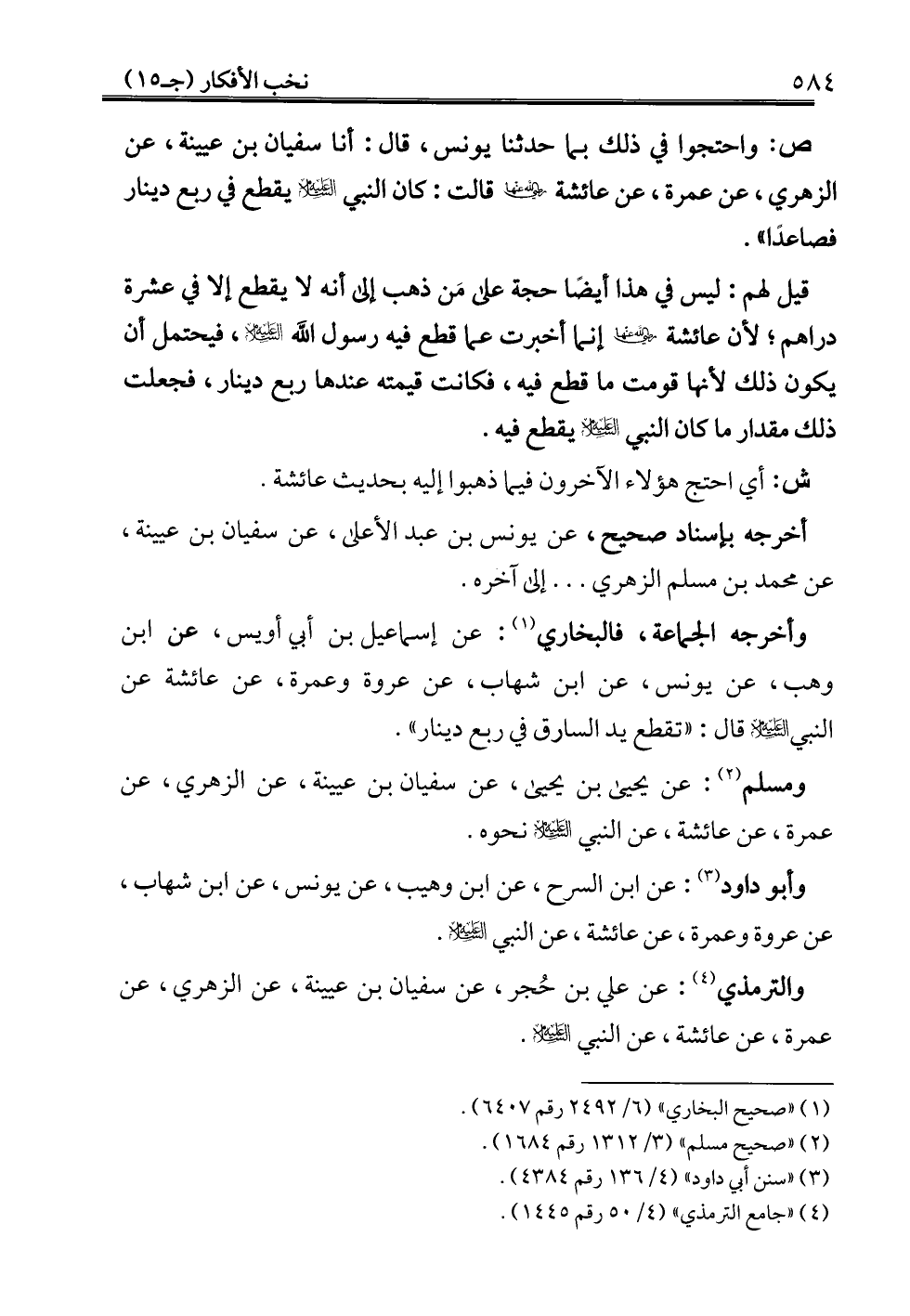 ص: واحتجوا في ذلك بما حدثنا يونس، قال: أنا سفيان بن عيينة، عن الزهري، عن عمرة، عن عائشة - رضي الله عنه - قالت: كان النبي -عليه السلام- يقطع في ربع دينار فصاعدًا".