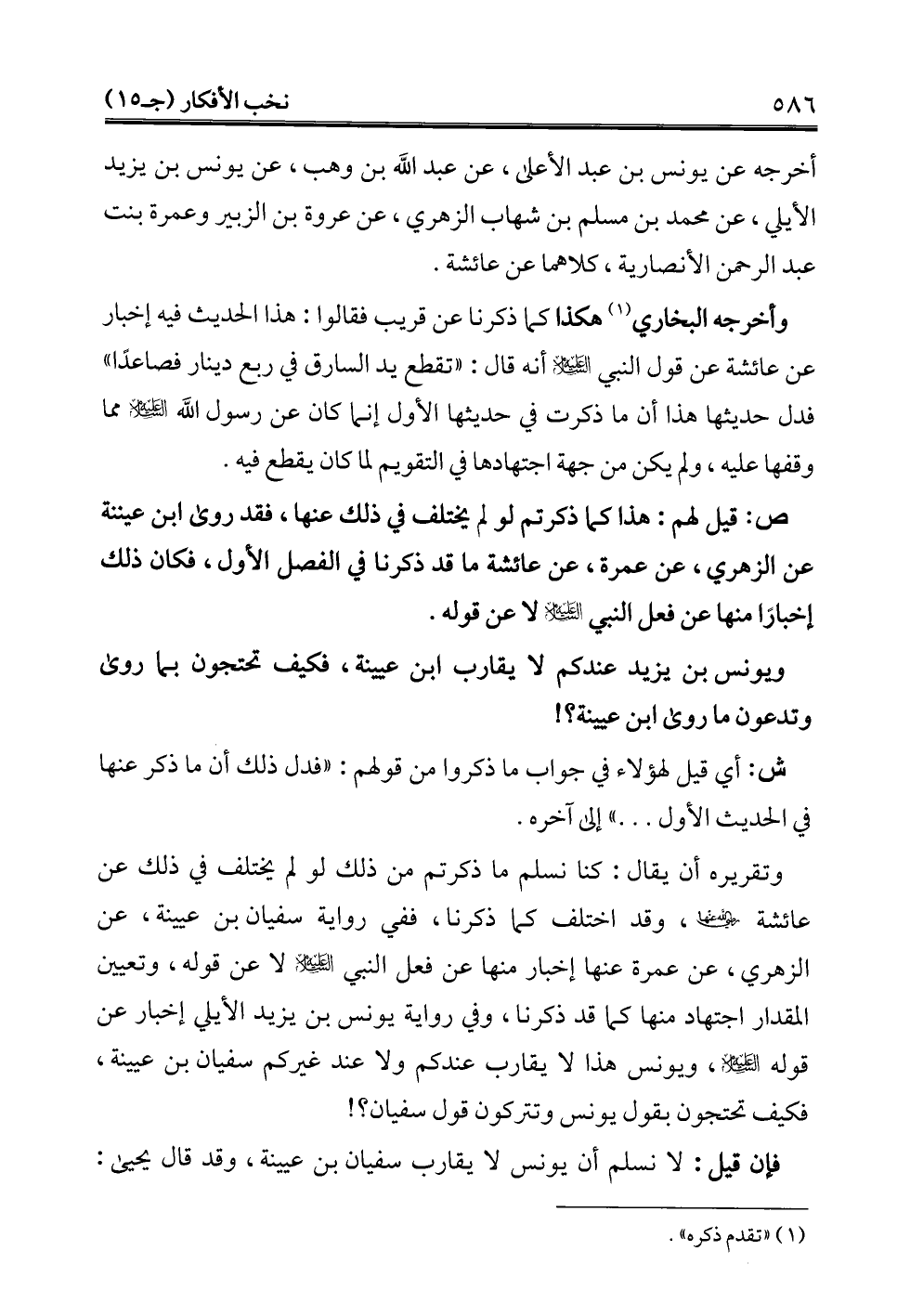 وتقريره أن يقال: كنا نسلم ما ذكرتم من ذلك لو لم يختلف في ذلك عن عائشة - رضي الله عنها -، وقد اختلف كما ذكرنا، ففي رواية سفيان بن عيينة، عن الزهري، عن عمرة عنها إخبار منها عن فعل النبي -عليه السلام- لا عن قوله، وتعيين المقدار اجتهاد منها كما قد ذكرنا، وفي رواية يونس بن يزيد الأيلي إخبار عن قوله -عليه السلام-، ويونس هذا لا يقارب عندكم ولا عند غيركم سفيان بن عيينة، فكيف تحتجون بقول يونس وتتركون قول سفيان؟!