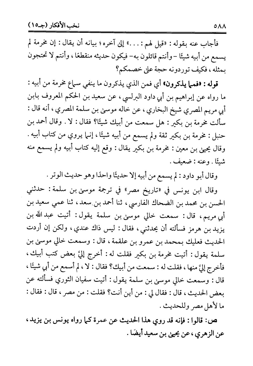 قوله: "فمما يذكرون" أي فمن الذي يذكرون ما ينفي سماع مخرمة من أبيه: ما رواه عن إبراهيم بن أبي داود البرلسي، عن سعيد بن الحكم المعروف بابن أبي مريم المصري شيخ البخاري، عن خاله موسى بن سلمة المصري، أنه قال: سألت مخرمة بن بكير: هل سمعت من أبيك شيئًا؟ فقال: لا. وقال أحمد بن حنبل: مخرمة بن بكير ثقة ولم يسمع من أبيه شيئًا، إنما يروي من كتاب أبيه. وقال يحيى بن معين: مخرمة بن بكير يقال: وقع إليه كتاب أبيه ولم يسمع منه شيئًا. وعنه: ضعيف.
