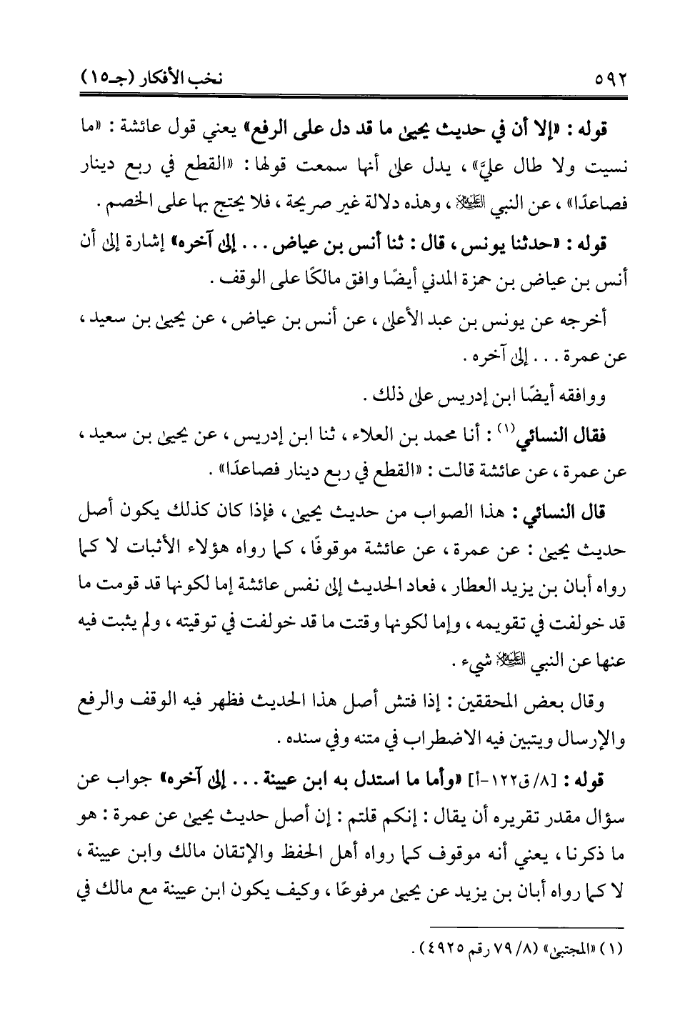 قوله: "وأما ما استدل به ابن عيينة. . . . إلى آخره" جواب عن سؤال مقدر تقريره أن يقال: إنكم قلتم: إن أصل حديث يحيى عن عمرة: هو ما ذكرنا، يعني أنه موقوف كما رواه أهل الحفظ والإتقان مالك وابن عيينة، لا كما رواه أبان بن يزيد عن يحيى مرفوعًا، وكيف يكون ابن عيينة مع مالك في