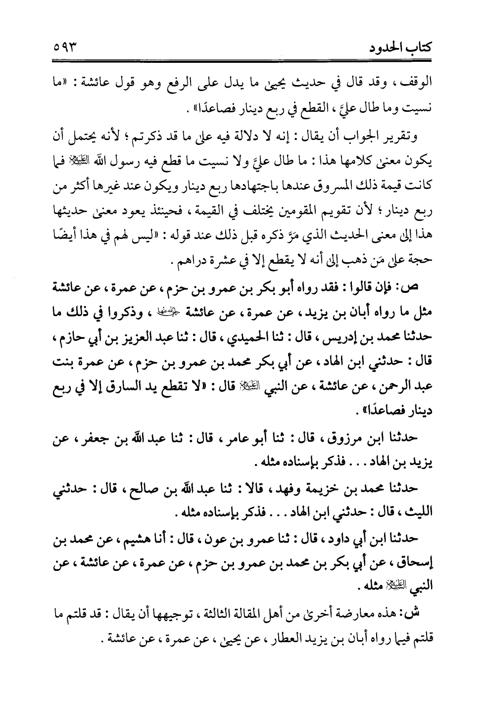 ص: فإن قالوا: فقد رواه أبو بكر بن عمرو بن حزم، عن عمرة، عن عائشة مثل ما رواه أبان بن يزيد، عن عمرة، عن عائشة - رضي الله عنها -، وذكروا في ذلك ما حدثنا محمد بن إدريس، قال: ثنا الحميدي، قال: ثنا عبد العزيز بن أبي حازم، قال: حدثني ابن الهاد، عن أبي بكر محمد بن عمرو بن حزم، عن عمرة بنت عبد الرحمن، عن عائشة، عن النبي -عليه السلام- قال: "لا تقطع يد السارق إلا في ربع دينار فصاعدًا".