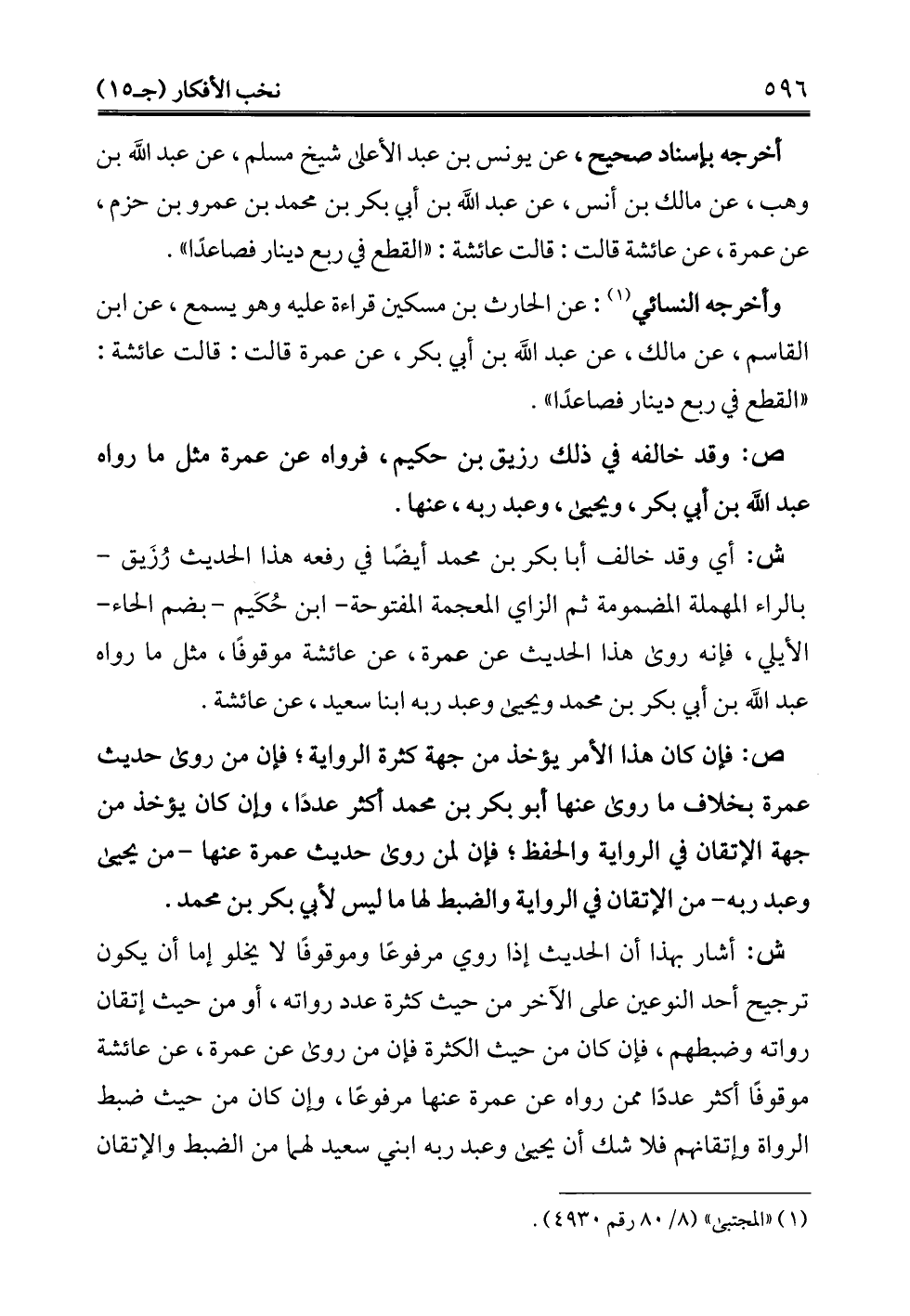 ش: أشار بهذا أن الحديث إذا روي مرفوعًا وموقوفًا لا يخلو إما أن يكون ترجيح أحد النوعين على الآخر من حيث كثرة عدد رواته، أو من حيث إتقان رواته وضبطهم، فإن كان من حيث الكثرة فإن من روى عن عمرة، عن عائشة موقوفًا أكثر عددًا ممن رواه عن عمرة عنها مرفوعًا، وإن كان من حيث ضبط الرواة وإتقانهم فلا شك أن يحيى وعبد ربه ابني سعيد لهما من الضبط والإتقان