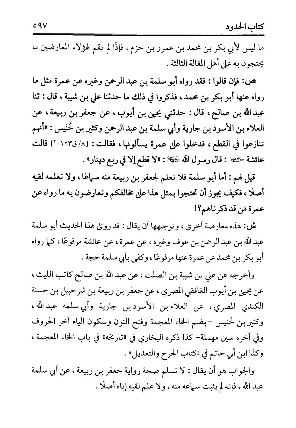 ما ليس لأبي بكر بن محمد بن عمرو بن حزم، فإذًا لم يقم لهؤلاء المعارضين ما يحتجون به على أهل المقالة الثالثة.