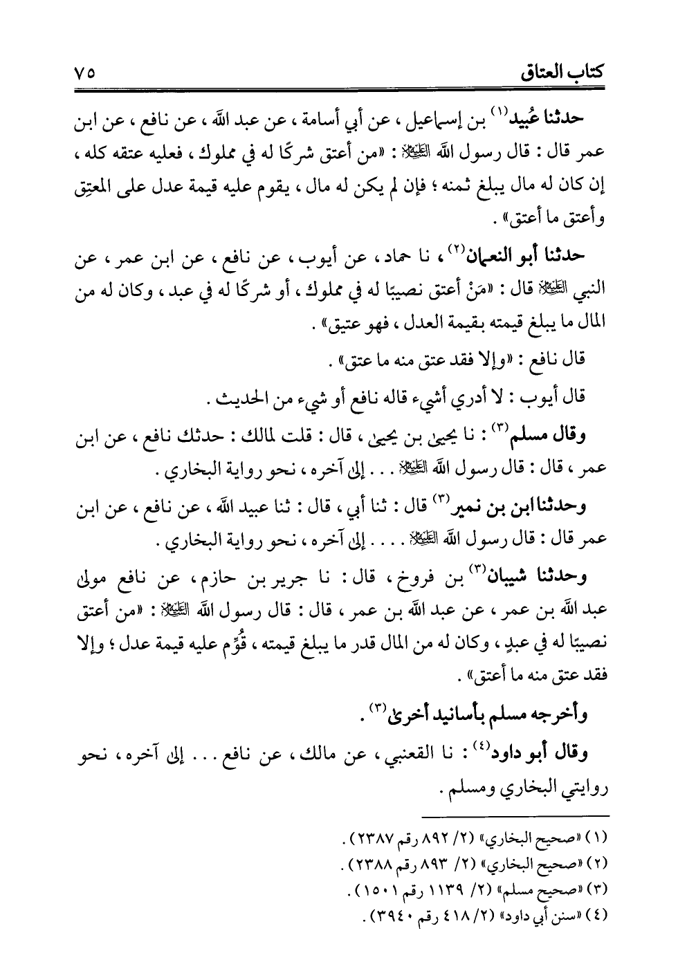 وحدثنا شيبان (3) بن فروخ، قال: نا جرير بن حازم، عن نافع مولى عبد الله بن عمر، عن عبد الله بن عمر، قال: قال رسول الله -عليه السلام-: "من أعتق نصيبًا له في عبدٍ، وكان له من المال قدر ما يبلغ قيمته، قُوِّم عليه قيمة عدل؛ وإلا فقد عتق منه ما أعتق".