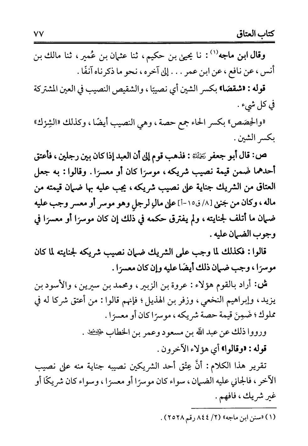 ش: أراد بالقوم هؤلاء: عروة بن الزبير، ومحمد بن سيرين، والأسود بن يزيد، وإبراهيم النخعي، وزفر بن الهذيل؛ فإنهم قالوا: من أعتق شركا له في مملوك؛ ضَمِنَ قيمة حصة شريكه، موسرًا كان أو معسرًا.
