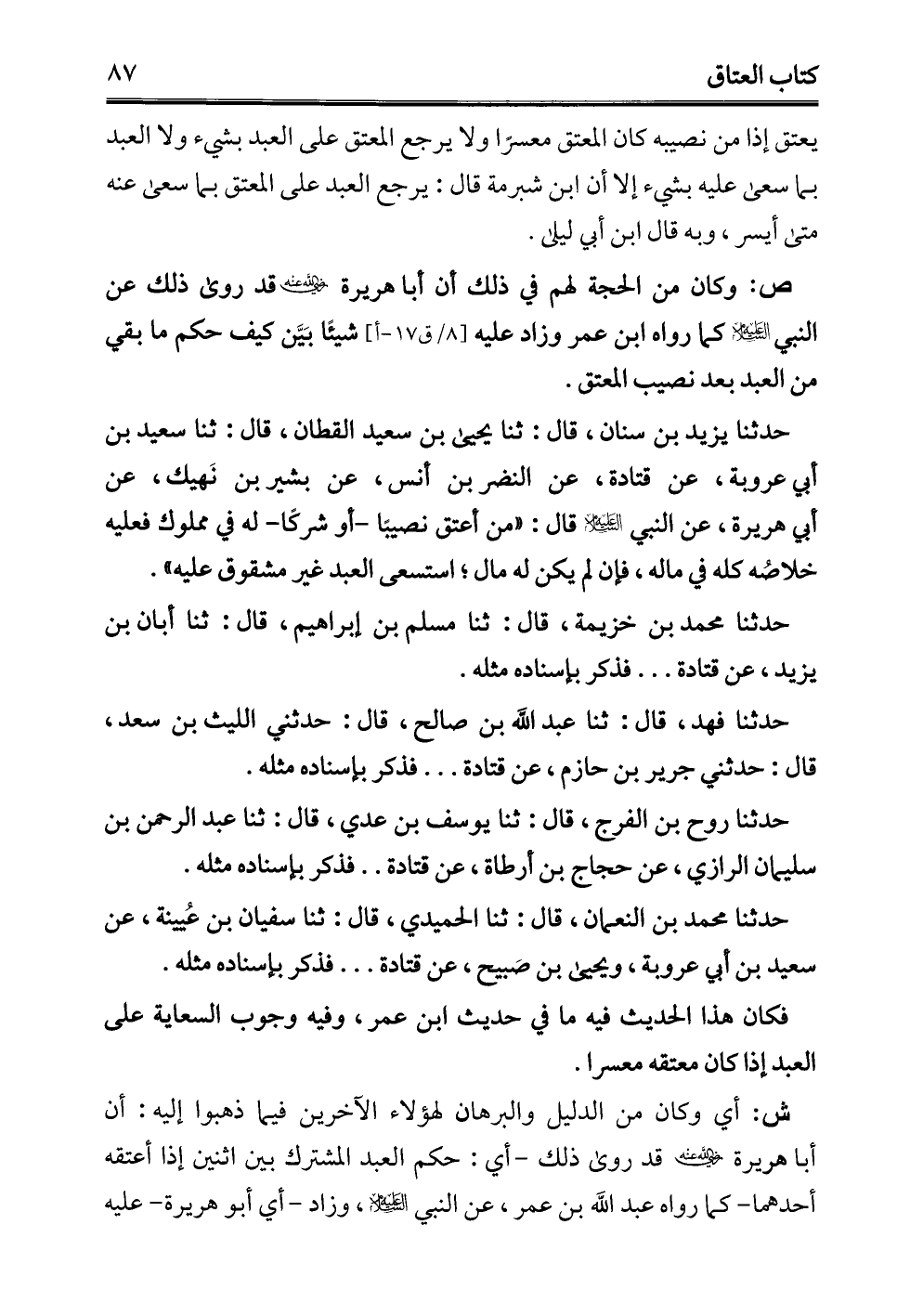 حدثنا يزيد بن سنان، قال: ثنا يحيى بن سعيد القطان، قال: ثنا سعيد بن أبي عروبة، عن قتادة، عن النضر بن أنس، عن بشير بن نَهيك، عن أبي هريرة، عن النبي -عليه السلام- قال: "من أعتق نصيبًا -أو شركًا- له في مملوك فعليه خلاصُه كله في ماله، فإن لم يكن له مال؛ استسعى العبد غير مشقوق عليه".