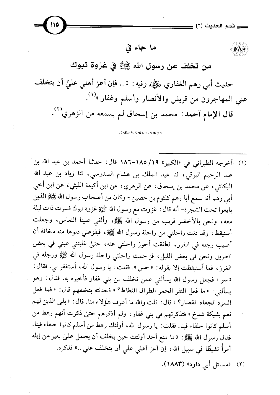 (¬1) أخرجه الطبراني في "الكبير" 19/ 185 - 186 قال: حدثنا أحمد بن عبد اللَّه بن عبد الرحيم البرقي، ثنا عبد الملك بن هشام السدوسي، ثنا زياد بن عبد اللَّه البكائي، عن محمد بن إسحاق، عن الزهري، عن ابن أكيمة الليثي، عن ابن أخي أبي رهم أنه سمع أبا رهم كلثوم بن حصين -وكان من أصحاب رسول اللَّه -صلى اللَّه عليه وسلم- الذين بايعوا تحت الشجرة- أنه قال: غزوت مع رسول اللَّه -صلى اللَّه عليه وسلم- غزوة تبوك فسرت ذات ليلة معه، ونحن بالأخضر قريب من رسول اللَّه -صلى اللَّه عليه وسلم-، وألقي علينا النعاس، وجعلت أستيقظ، وقد دنت راحلتي من راحلة رسول اللَّه -صلى اللَّه عليه وسلم-، فيفزعني دنوها منه مخافة أن أصيب رجله في الغرز، فطفقت أحوز راحلتي عنه، حتى غلبتني عيني في بعض الطريق ونحن في بعض الليل، فزاحمت راحلتي راحلة رسول اللَّه -صلى اللَّه عليه وسلم- ورجله في الغرز، فما استيقظت إلا بقوله: "حس". فقلت: يا رسول اللَّه، استغفر لي. فقال: "سر" فجعل رسول اللَّه يسألني عمن تخلف من بني غفار فأخبره به. فقال: وهو يسألني: "ما فعل النفر الحمر الطوال الثطاط؟ " فحدثته بتخلفهم قال: "فما فعل السود الجعاد القصار؟ " قال: قلت واللَّه ما أعرف هؤلاء منا. قال: "بلى الذين لهم نعم بشبكة شدخ" فتذكرتهم في بني غفار، ولم أذكرهم حتى ذكرت أنهم رهط من أسلم كانوا حلفاء فينا. فقلت: يا رسول اللَّه، أولئك وهي من أسلم كانوا حلفاء فينا. فقال رسول اللَّه -صلى اللَّه عليه وسلم-: "ما منع أحد أولئك حين يخلف أن يحمل على بعير من إبله أمرأً نشيطًا في سبيل اللَّه، إن أعز أهلي على أن يتخلف عني. . " فذكره.