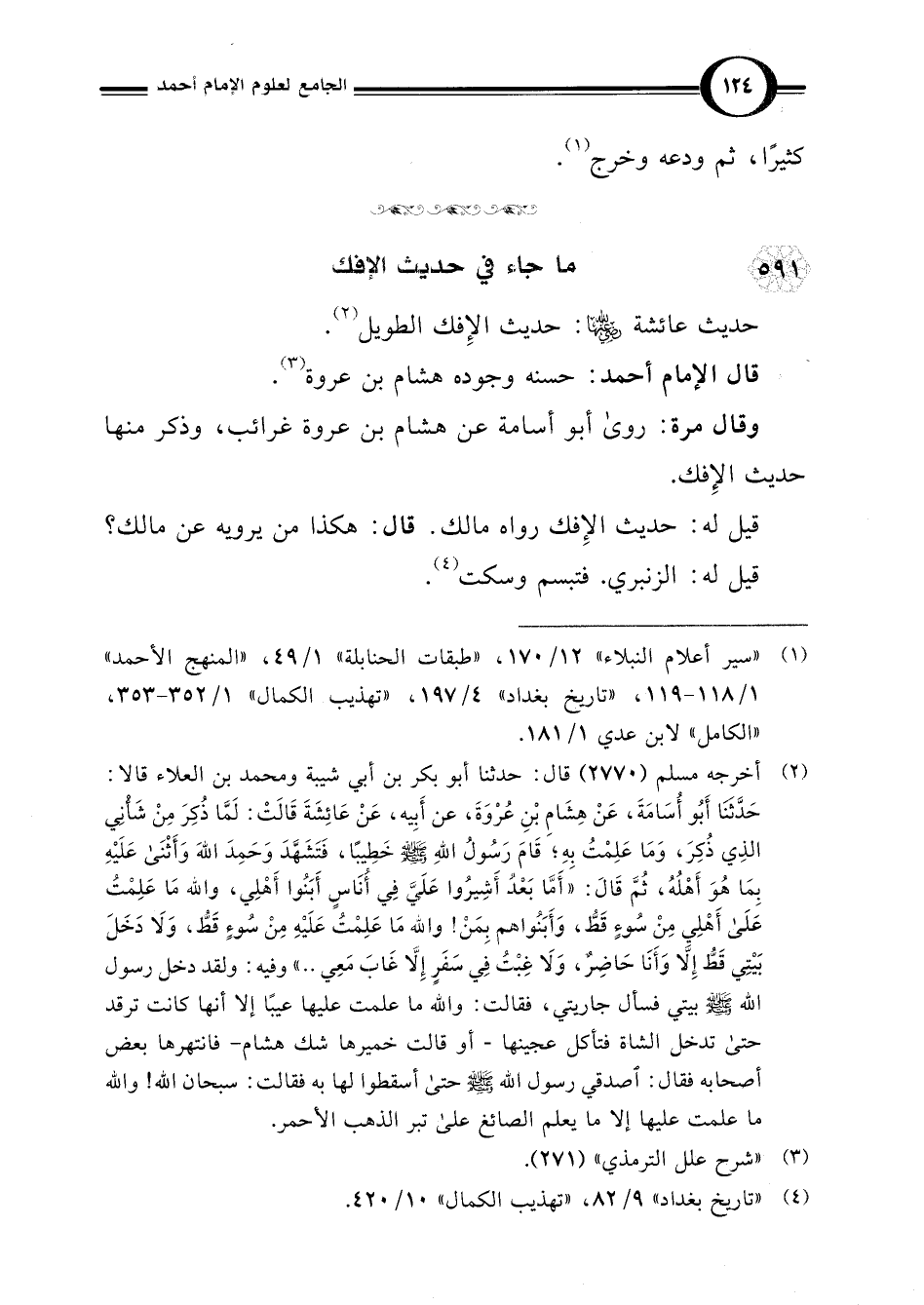 وقال مرة: روى أبو أسامة عن هشام بن عروة غرائب، وذكر منها حديث الإِفك.