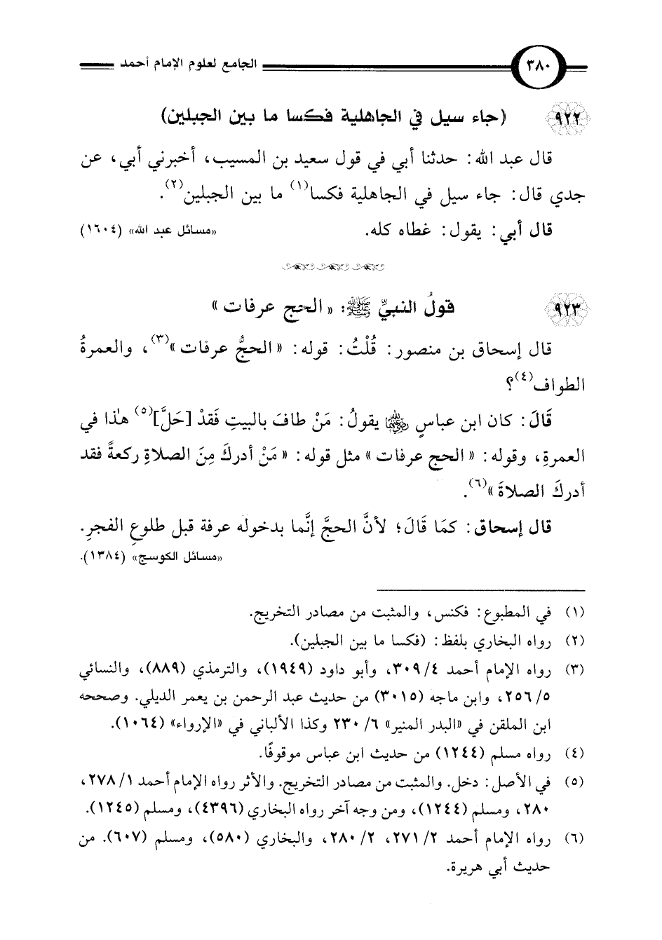 قال إسحاق بن منصور: قُلْتُ: قوله: "الحجُّ عرفات" (¬3)، والعمرةُ الطواف (¬4)؟