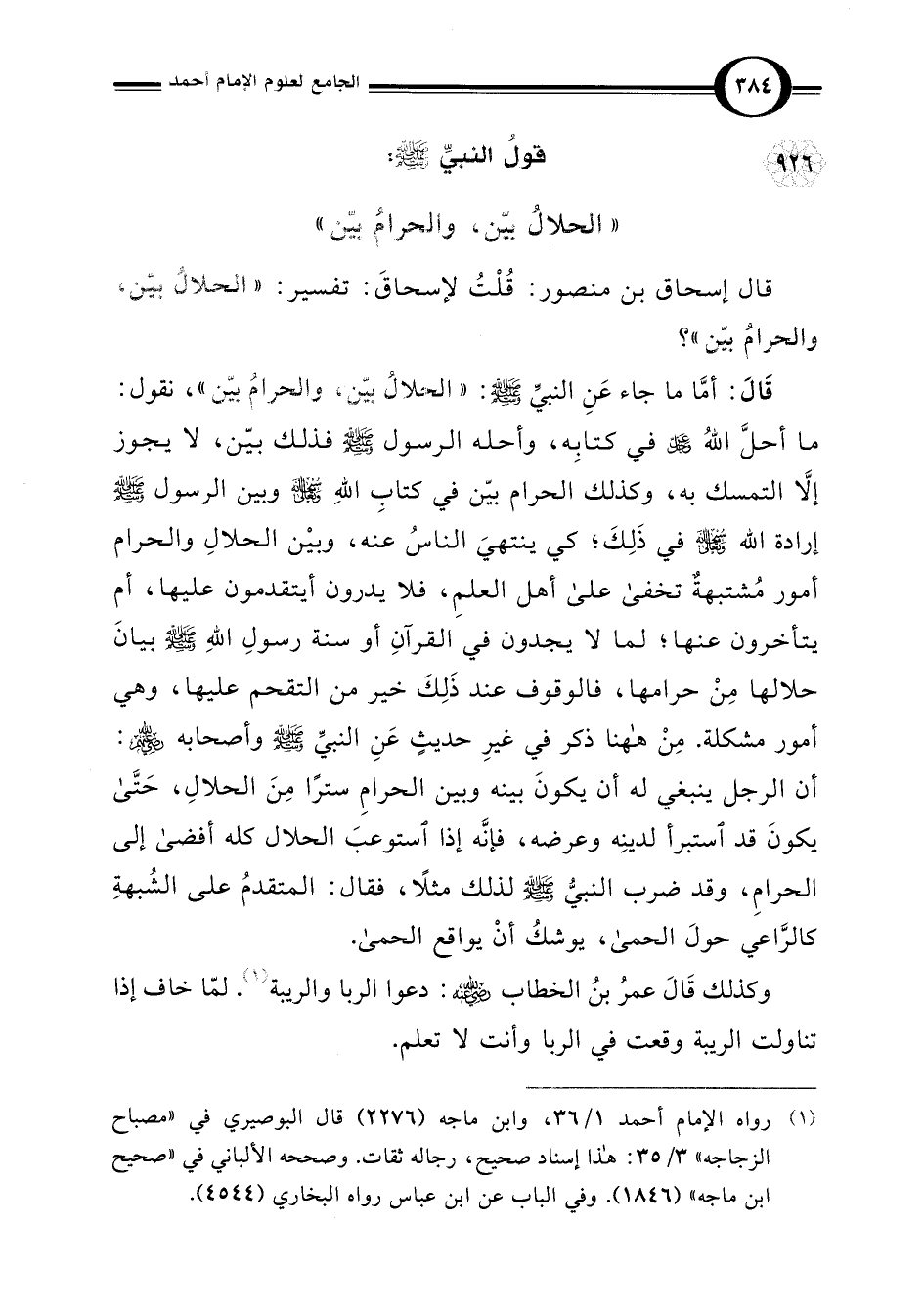 قال إسحاق بن منصور: قُلْتُ لإسحاقَ: تفسير: "الحلالُ بيّن، والحرامُ بيّن"؟
