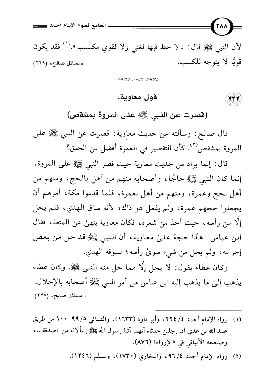 قال صالح: وسألته عن حديث معاوية: قصرت عن النبي -صلى اللَّه عليه وسلم- على المروة بمشقص (¬2). كأن التقصير في العمرة أفضل من الحلق؟