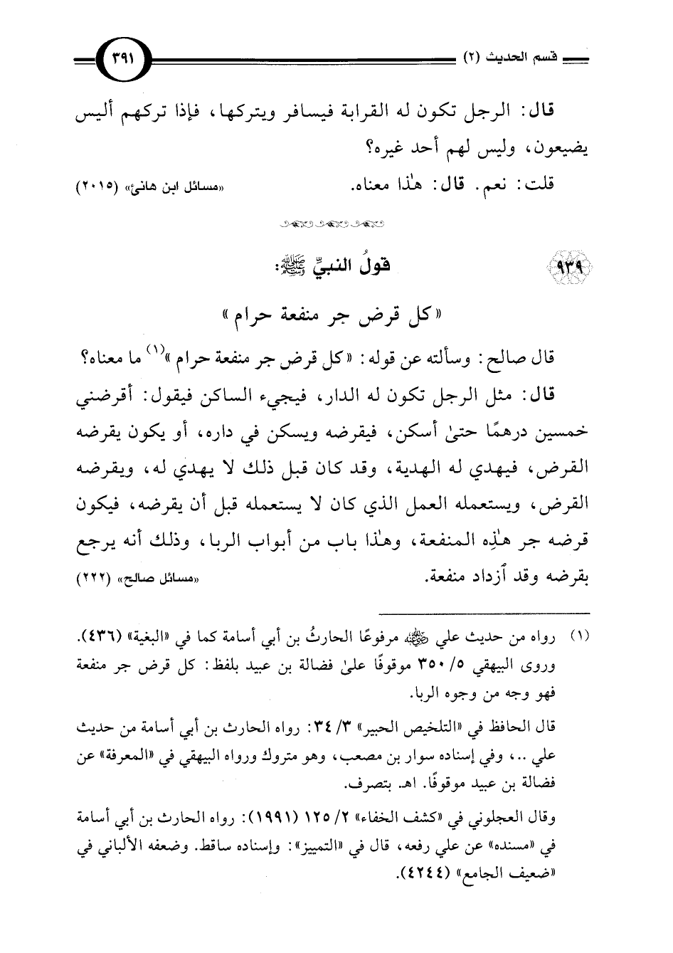 (¬1) رواه من حديث علي -رضي اللَّه عنه- مرفوعًا الحارثُ بن أبي أسامة كما في "البغية" (436). وروى البيهقي 5/ 350 موقوفًا على فضالة بن عبيد بلفظ: كل قرض جر منفعة فهو وجه من وجوه الربا.
