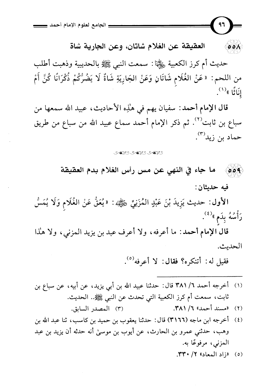 الأول: حديث يَزِيدَ بْنَ عَبْدٍ المُزَنِيِّ -رضي اللَّه عنه-: "يُعَقُّ عَنْ الغُلَامِ وَلَا يُمَسُّ رَأْسُهُ بِدَمٍ" (¬4).