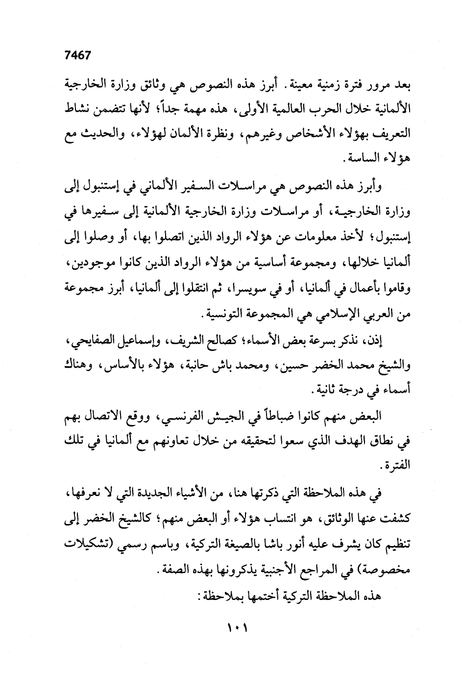 واْبرز هذه النصوص هي مراسلات السفير الألماني في إستنبول إلى وزارة الخارجية، أو مراسلات وزارة الخارجية الألمانية إلى سفيرها في إستنبول؛ لأخذ معلومات عن هؤلاء الرواد الذين اتصلوا بها، أو وصلوا إلى ألمانيا خلالها، ومجموعة أساسية من هؤلاء الرواد الذين كانوا موجودين، وقاموا بأعمال في ألمانيا، أو في سويسرا، ثم انتقلوا إلى ألمانيا، أبرز مجموعة من العربي الإسلامي هي المجموعة التونسية.