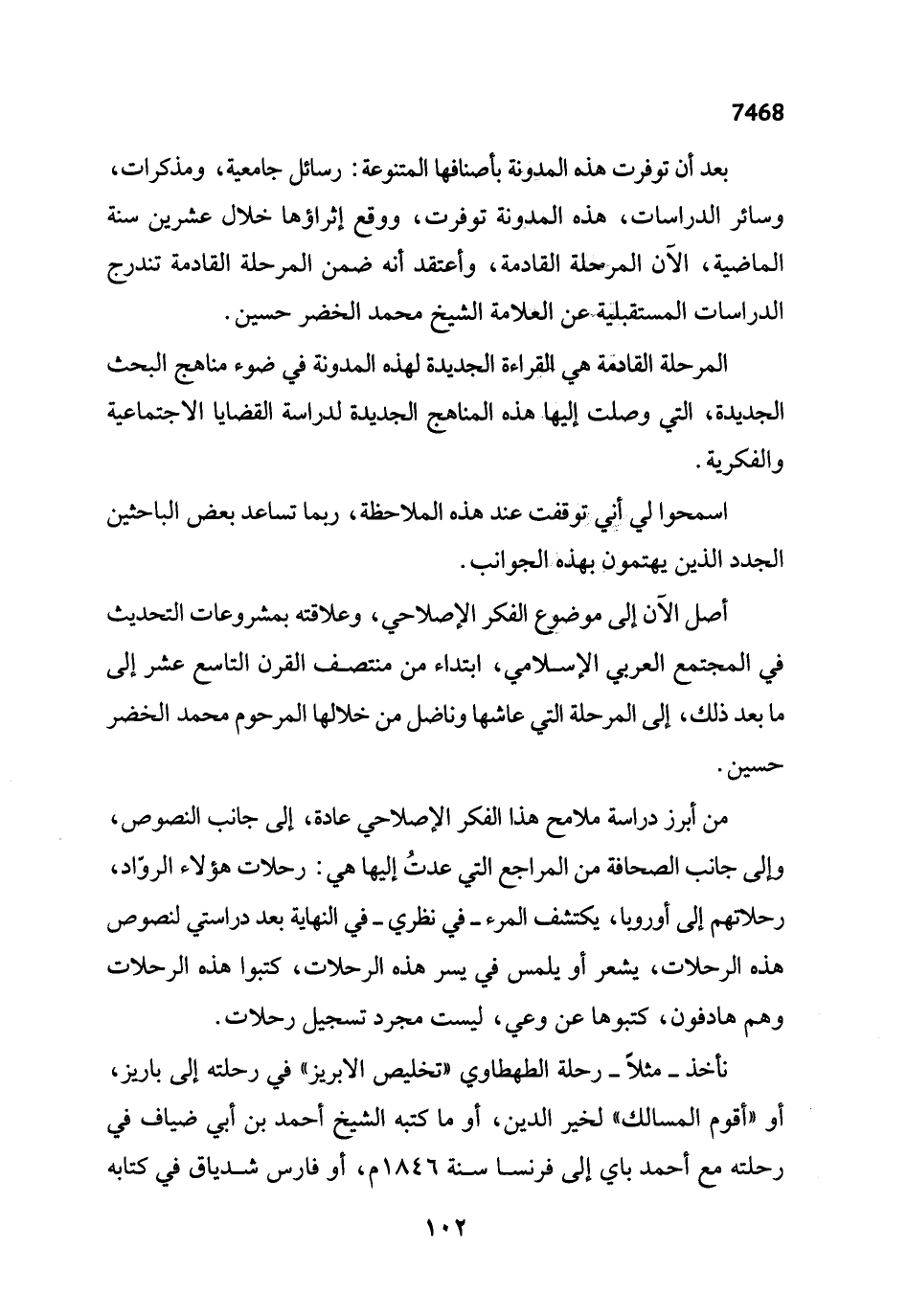 من أبرز دراسة ملامح هذا الفكر الإصلاحي عادة، إلى جانب النصوص، وإلى جانب الصحافة من المراجع التي عدتُ إليها هي: رحلات هؤلاء الروّاد، رحلاتهم إلى أوروبا، يكتشف المرء -في نظري- في النهاية بعد دراستي لنصوص هذه الرحلات، يشعر أو يلمس في يسر هذه الرحلات، كتبوا هذه الرحلات وهم هادفون، كتبوها عن وعي، ليست مجرد تسجيل رحلات.