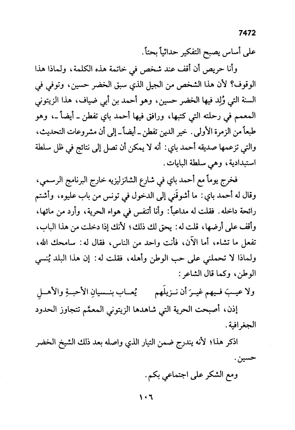 وأنا حريص أن أقف عند شخص في خاتمة هذه الكلمة، ولماذا هذا الوقوف؟ لأن هذا الشخص من الجيل الذي سبق الخضر حسين، وتوفي في السنة التي وُلد فيها الخضر حسين، وهو أحمد بن أبي ضياف، هذا الزيتوني المعمم في رحلته التي كتبها، ورافق فيها أحمد باي تفطن -أيضاً-، وهو طبعاً من الزمرة الأولى. خير الدين تفطن -أيضاً- إلى أن مشروعات التحديث، والتي تزعمها صديقه أحمد باي: أنه لا يمكن أن تصل إلى نتائج في ظل سلطة استبدادية، وهي سلطة البايات.