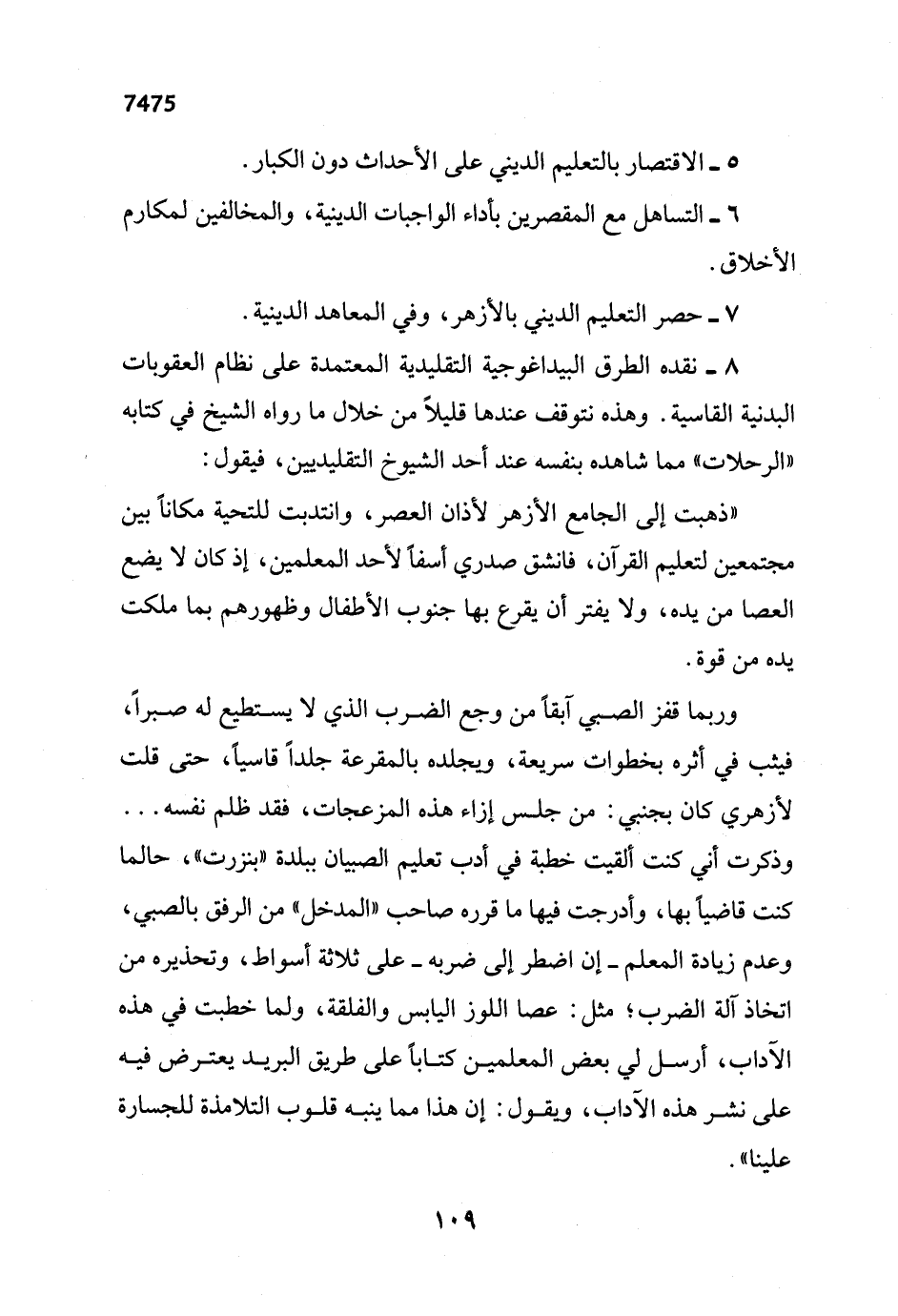 8 - نقده الطرق البيداغوجية التقليدية المعتمدة على نظام العقوبات البدنية القاسية. وهذه نتوقف عندها قليلاً من خلال ما رواه الشيخ في كتابه "الرحلات" مما شاهده بنفسه عند أحد الشيوخ التقليديين، فيقول:
