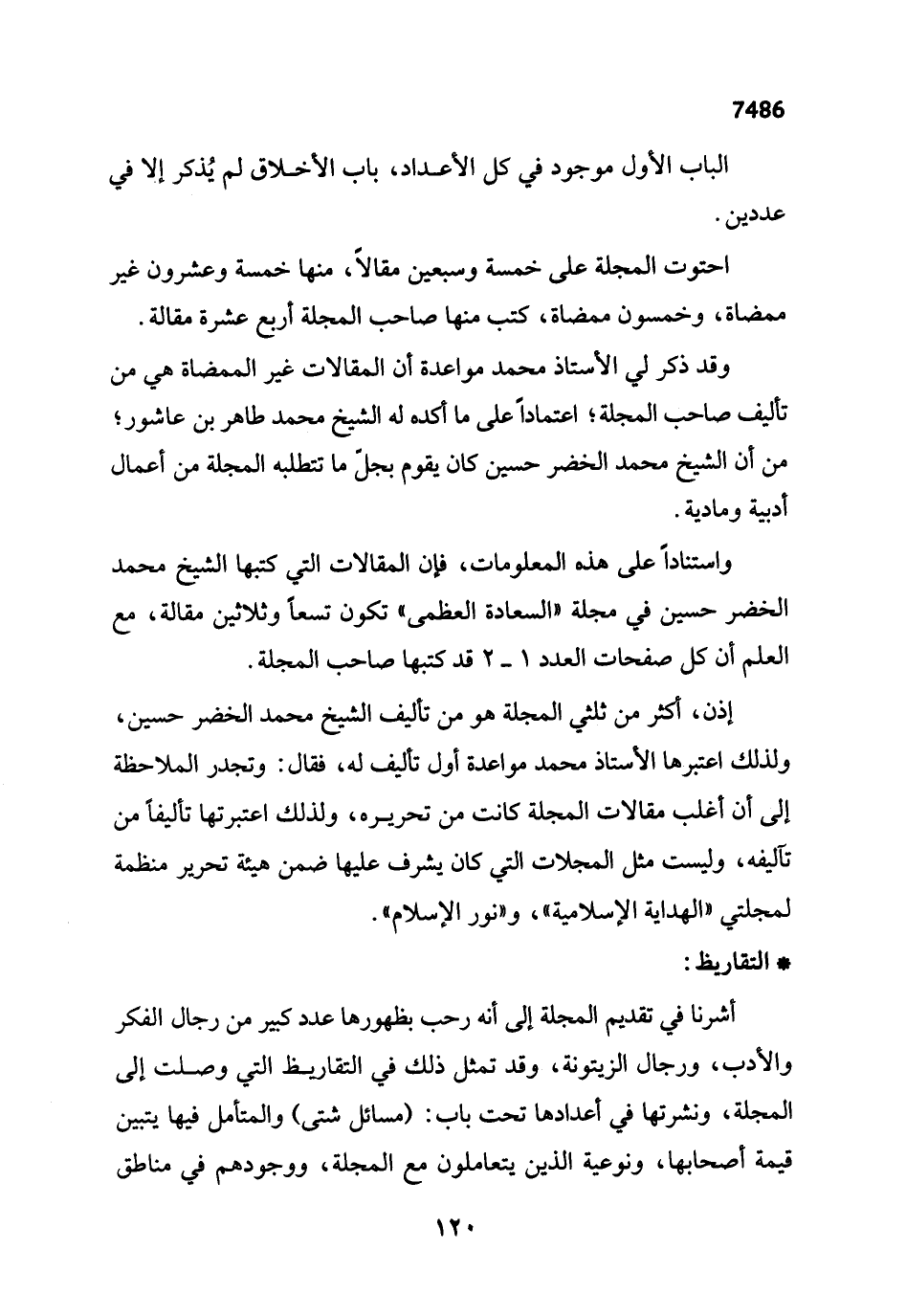 وقد ذكر لي الأستاذ محمد مواعدة أن المقالات غير الممضاة هي من تأليف صاحب المجلة؛ اعتماداً على ما أكده له الشيخ محمد طاهر بن عاشور؛ من أن الشيخ محمد الخضر حسين كان يقوم بجل ما تتطلبه المجلة من أعمال أدبية ومادية.
