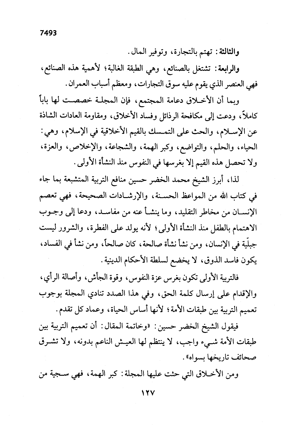 فيقول الشيخ الخضر حسين: "وخاتمة المقال: أن تعميم التربية بين طبقات الأمة شيء واجب، لا ينتظم لها العيش الناعم بدونه، ولا تشرق صحائف تاريخها بسواه".