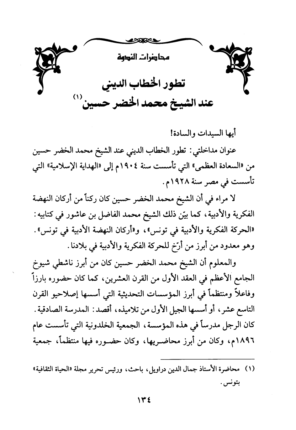 عنوان مداخلتي: تطور الخطاب الديني عند الشيخ محمد الخضر حسين من "السعادة العظمى" التي تأسست سنة 1904 م إلى "الهداية الإسلامية" التي تأسست في مصر سنة 1928 م.