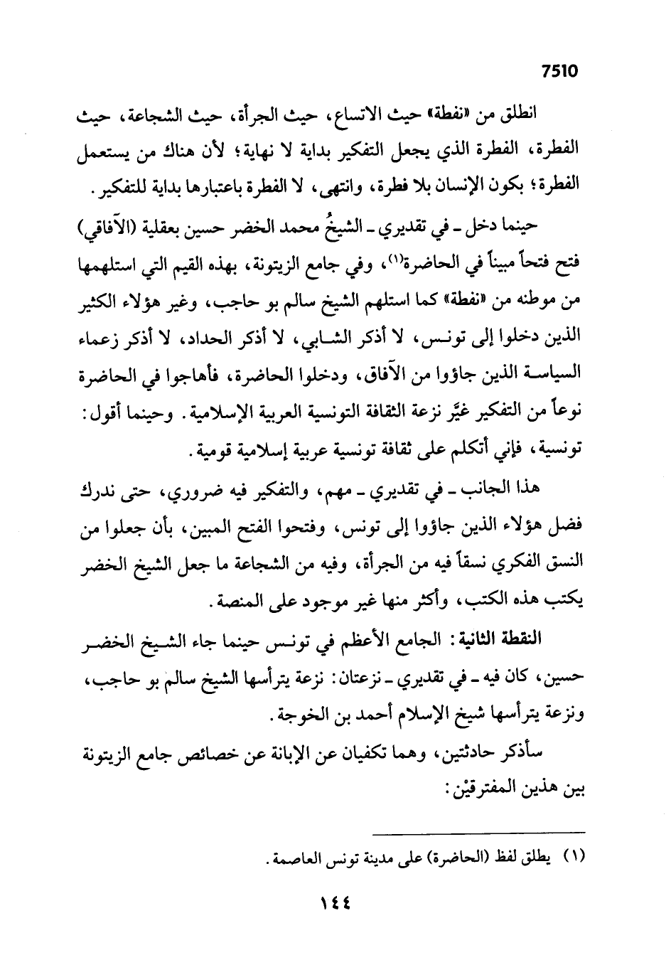 حينما دخل -في تقديري- الشيخُ محمد الخضر حسين بعقلية (الآفاقي) فتح فتحاً مبينا في الحاضرة (¬1)، وفي جامع الزيتونة، بهذه القيم التي استلهمها من موطنه من "نقطة" كما استلهم الشيخ سالم بو حاجب، وغير هؤلاء الكثير الذين دخلوا إلى تونس، لا أذكر الشابي، لا أذكر الحداد، لا أذكر زعماء السياسة الذين جاؤوا من الآفاف، ودخلوا الحاضرة، فأهاجوا في الحاضرة نوعا من التفكير غيَّر نزعة الثقافة التونسية العربية الإسلامية. وحينما أقول: تونسية، فإني أتكلم على ثقافة تونسية عربية إسلامية قومية.