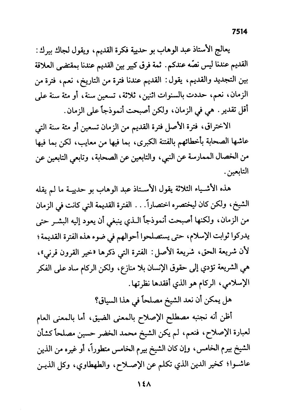 هذه الأشياء الثلاثة يقول الأستاذ عبد الوهاب بو حديية ما لم يقله الشيخ، ولكن كان ليختصره اختصاراً ... الفترة القديمة التي كانت في الزمان من الزمان، ولكنها أصبحت أنموذجاً لذي ينبغي أن يعود إليه البشر حتى يدركوا ثوابت الإسلام، حتى يستصلحوا أحوالهم في ضوء هذه الفترة القديمة؛ لأن شريعة الحق، شريعة الأصل: الفترة التي ذكرها "خير القرون قرني"، هي الشريعة تؤدي إلى حقوق الإنسان بلا منازع، ولكن الركام ساد على الفكر الإسلامي، الركام هو الذي أفقدها نظرتها.