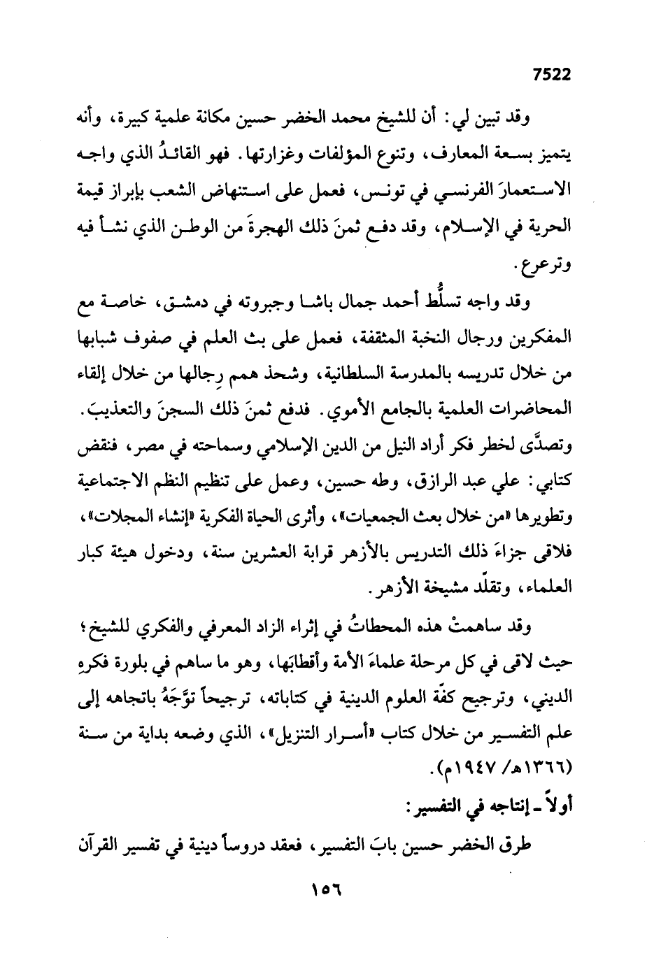 وقد تبين لي: أن للشيخ محمد الخضر حسين مكانة علمية كبيرة، وأنه يتميز بسعة المعارف، وتنوع المؤلفات وغزارتها. فهو القائدُ الذي واجه الاستعمارَ الفرنسي في تونس، فعمل على استنهاض الشعب بإبراز قيمة الحرية في الإسلام، وقد دفع ثمنَ ذلك الهجرةَ من الوطن الذي نشأ فيه وترعرع.
