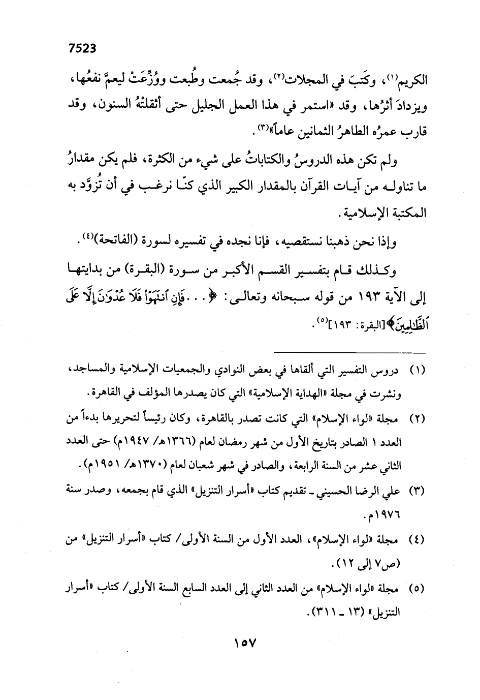 ولم تكن هذه الدروسُ والكتاباتُ على شيء من الكثرة، فلم يكن مقدارُ ما تناوله من آيات القرآن بالمقدار الكبير الذي كنّا نرغب في أن تُزوَّد به المكتبة الإسلامية.