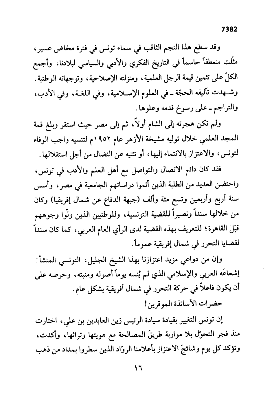إن تونس التغيير بقيادة سيادة الرئيس زين العابدين بن علي، اختارت منذ فجر التحوّل بلا مواربة طريقَ المصالحة مع هويتها وتراثها، وأكدت، وتؤكد كل يوم وشائجَ الاعتزاز بأعلامنا الروّاد الذين سطروا بمداد من ذهب
