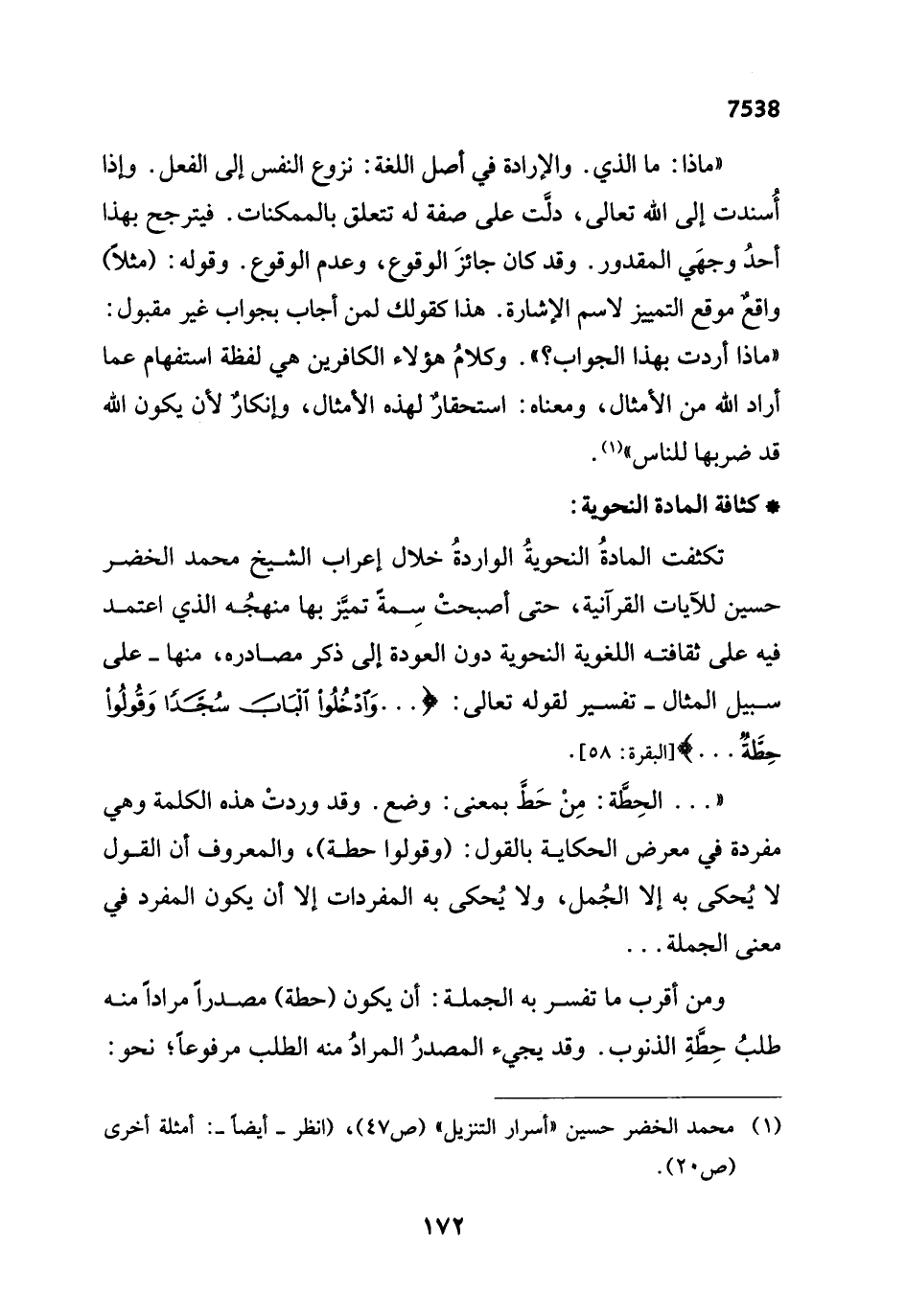 تكثفت المادةُ النحويةُ الواردةُ خلال إعراب الشيخ محمد الخضر حسين للآيات القرآنية، حتى أصبحتْ سِمةَ تميَّز بها منهجُه الذي اعتمد فيه على ثقافته اللغوية النحوية دون العودة إلى ذكر مصادره، منها -على سبيل المثال- تفسير لقوله تعالى: {وَادْخُلُوا الْبَابَ سُجَّدًا وَقُولُوا حِطَّةٌ} [البقرة: 58].