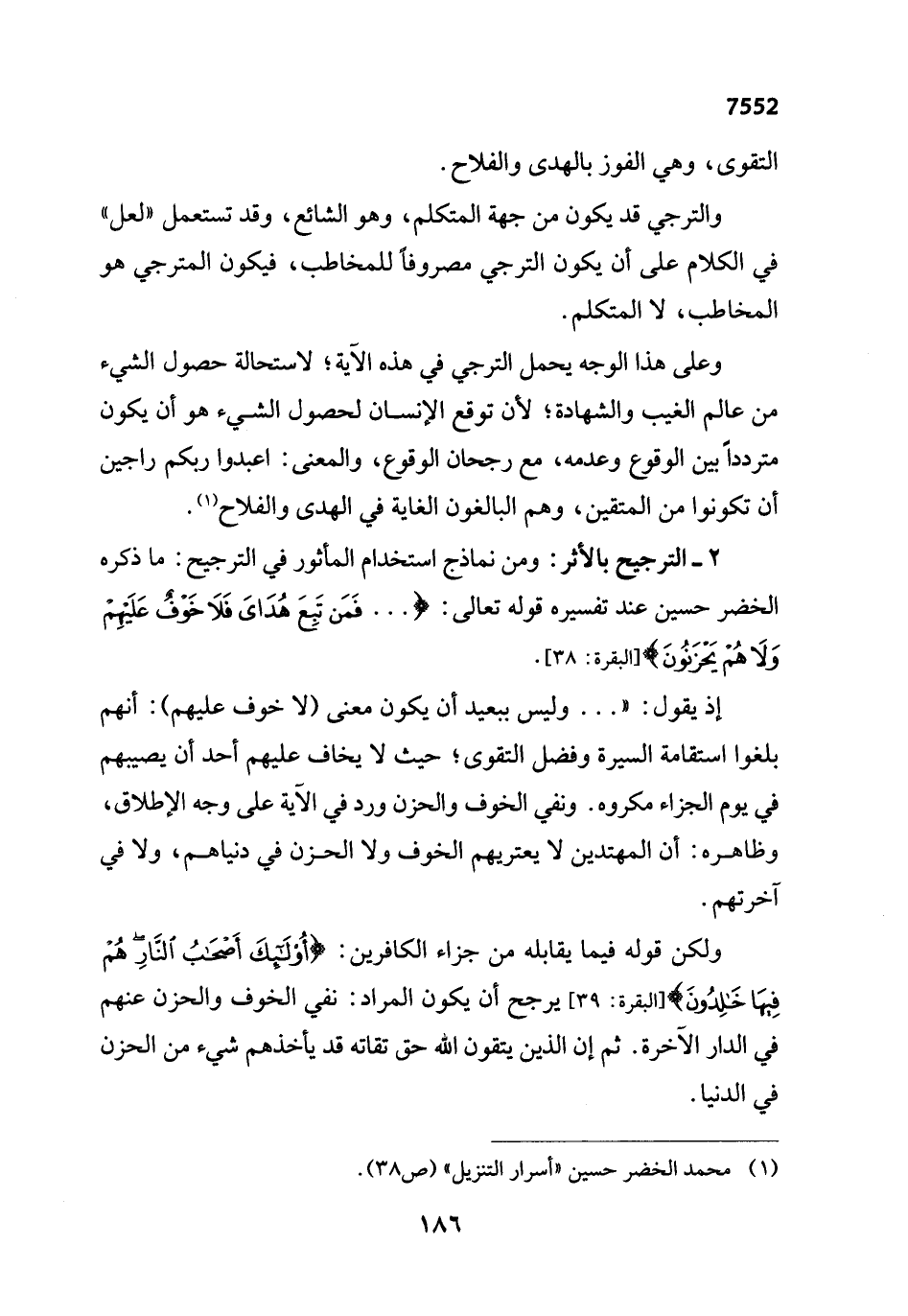 2 - الترجيح بالأثر: ومن نماذج استخدام المأثور في الترجيح: ما ذكره الخضر حسين عند تفسيره قوله تعالى: {. . . فَمَنْ تَبِعَ هُدَايَ فَلَا خَوْفٌ عَلَيْهِمْ وَلَا هُمْ يَحْزَنُونَ} [البقرة: 38].