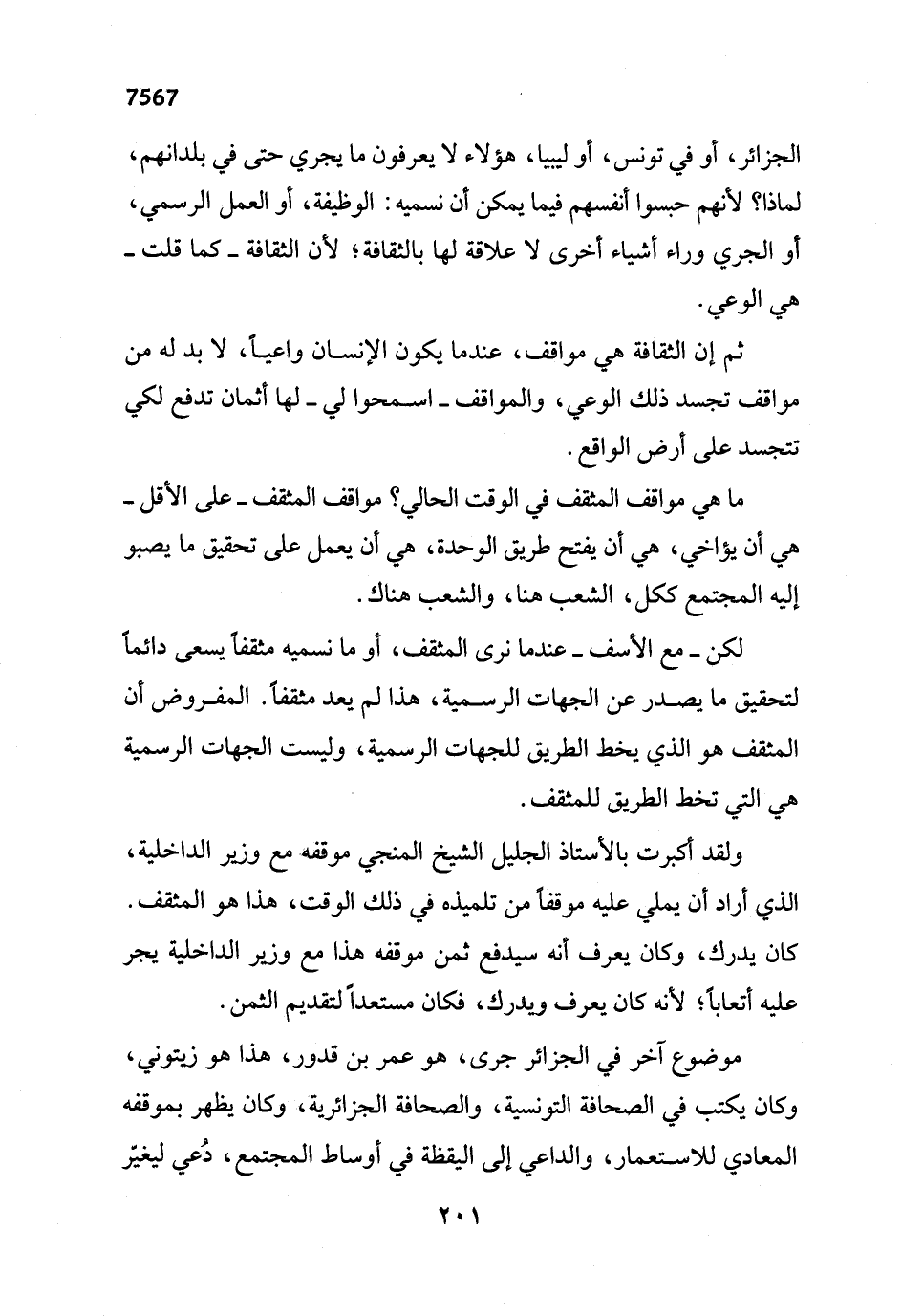 الجزائر، أو في تونس، أو ليبيا، هؤلاء لا يعرفون ما يجري حتى في بلدانهم، لماذا؟ لأنهم حبسوا أنفسهم فيما يمكن أن نسميه: الوظيفة، أو العمل الرسمي، أو الجري وراء أشياء أخرى لا علاقة لها بالثقافة؛ لأن الثقافة -كما قلت- هي الوعي.