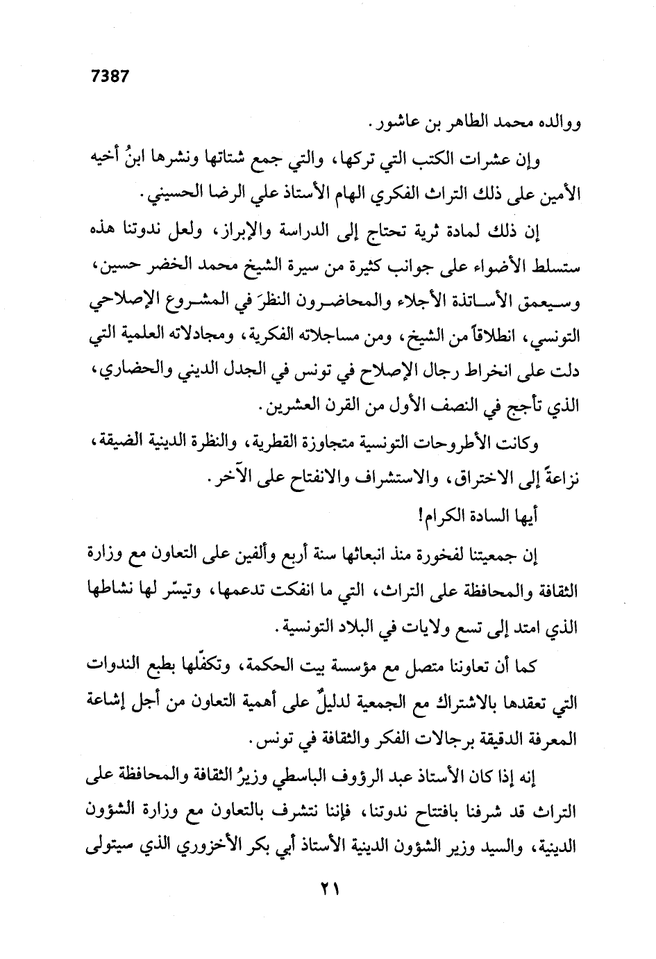 إنه إذا كان الأستاذ عبد الرؤوف الباسطي وزيرُ الثقافة والمحافظة على التراث قد شرفنا بافتتاح ندوتنا، فإننا نتشرف بالتعاون مع وزارة الشؤون الدينية، والسيد وزير الشؤون الدينية الأستاذ أبي بكر الأخزوري الذي سيتولى