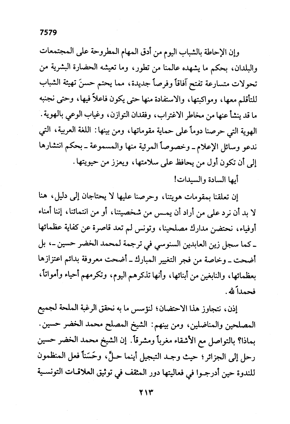 إن تعلقنا بمقومات هويتنا، وحرصنا عليها لا يحتاجان إلى دليل، هنا لابد أن نرد على من أراد أن يمس من شخصيتنا، أو من انتمائنا، إننا أمناء أوفياء، نحتضن مدارك مصلحينا، وتونس لم تعد قاصرة عن كفاية عظمائها -كما سجل زين العابدين السنوسي في ترجمة لمحمد الخضر حسين- بل أضحت -وخاصة من فجر التغيير المبارك- أضحت معروفة بدائم اعتزازها بعظمائها، والنابغين من أبنائها، وأنها تذكرهم اليوم، وتكرمهم أحياء وأمواتاً، فحمداً لله.