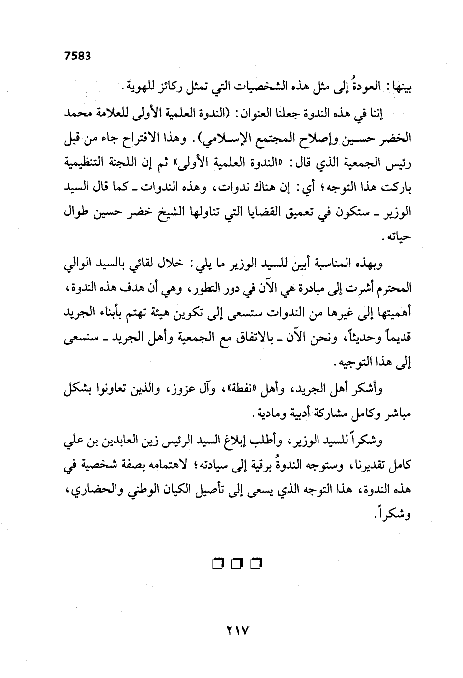 وشكراً للسيد الوزير، وأطلب إبلاع السيد الرئيس زين العابدين بن علي كامل تقديرنا، وستوجه الندوةُ برقية إلى سيادته؛ لاهتمامه بصفة شخصية في هذه الندوة، هذا التوجه الذي يسعى إلى تأصيل الكيان الوطني والحضاري، وشكراً.