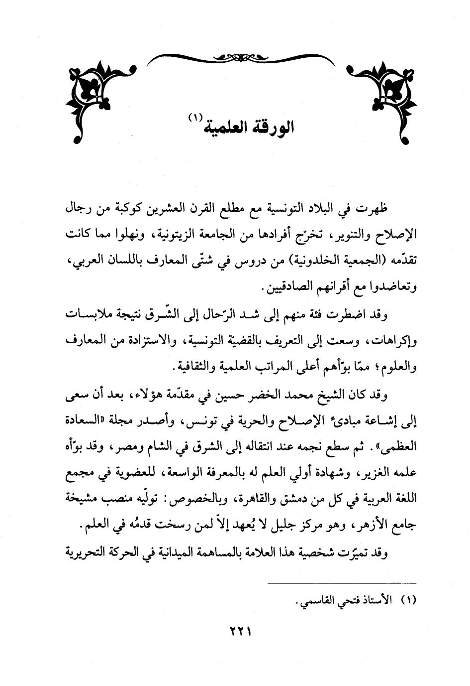 وقد كان الشيخ محمد الخضر حسين في مقدّمة هؤلاء، بعد أن سعى إلى إشاعة مبادئ الإصلاح والحرية في تونس، وأصدر مجلة "السعادة العظمى". ثم سطع نجمه عند انتقاله إلى الشرق في الشام ومصر، وقد بوّأه علمه الغزير، وشهادة أولي العلم له بالمعرفة الواسعة، للعضوية في مجمع اللغة العربية في كل من دمشق والقاهرة، وبالخصوص: تولّيه منصب مشيخة جامع الأزهر، وهو مركز جليل لا يُعهد إلّا لمن رسخت قدمُه في العلم.