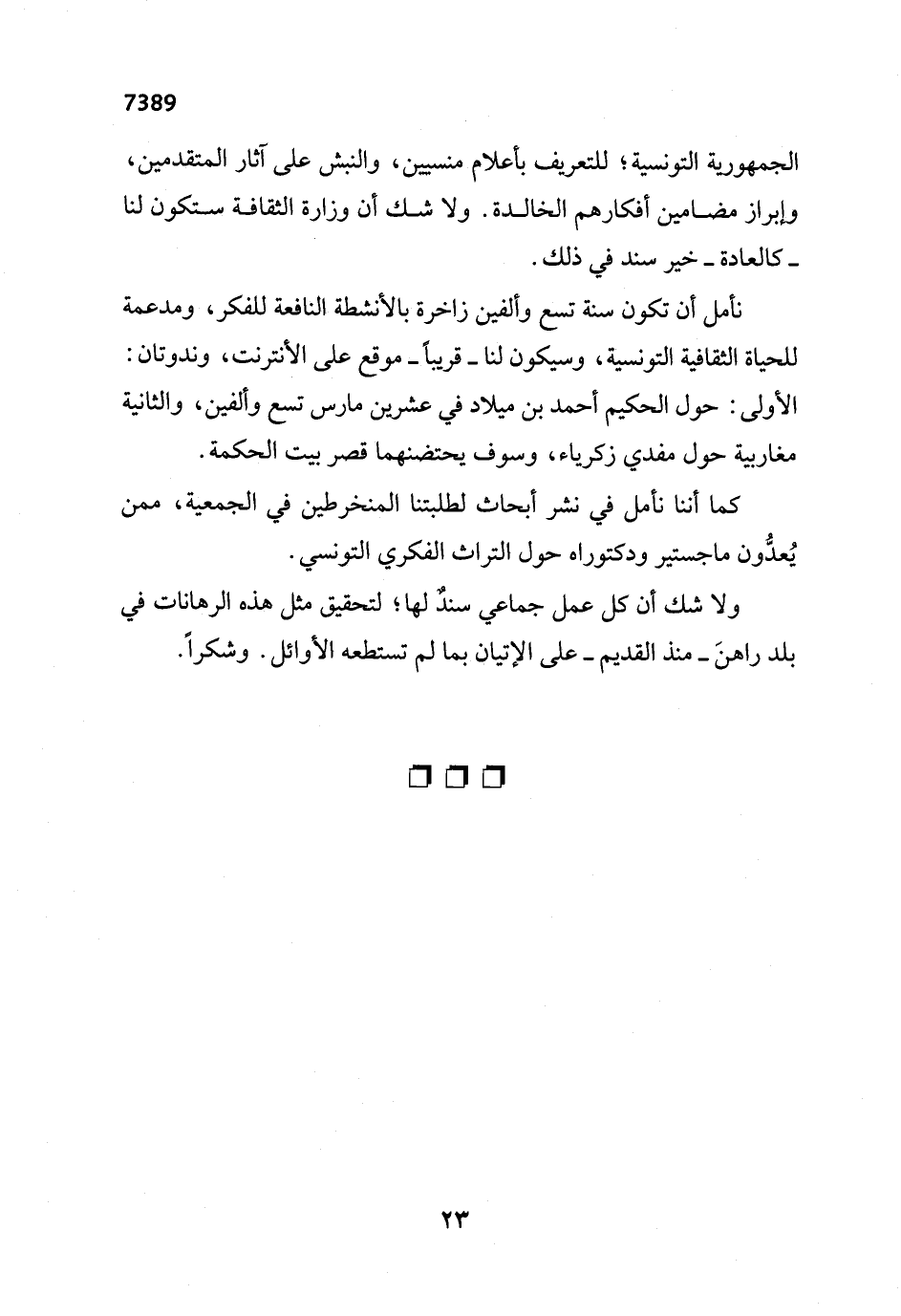 نأمل أن تكون سنة تسع وألفين زاخرة بالأنشطة النافعة للفكر، ومدعمة للحياة الثقافية التونسية، وسيكون لنا -قريباً- موقع على الأنترنت، وندوتان: الأولى: حول الحكيم أحمد بن ميلاد في عشرين مارس تسع وألفين، والثانية مغاربية حول مفدي زكرياء، وسوف يحتضنهما قصر بيت الحكمة.