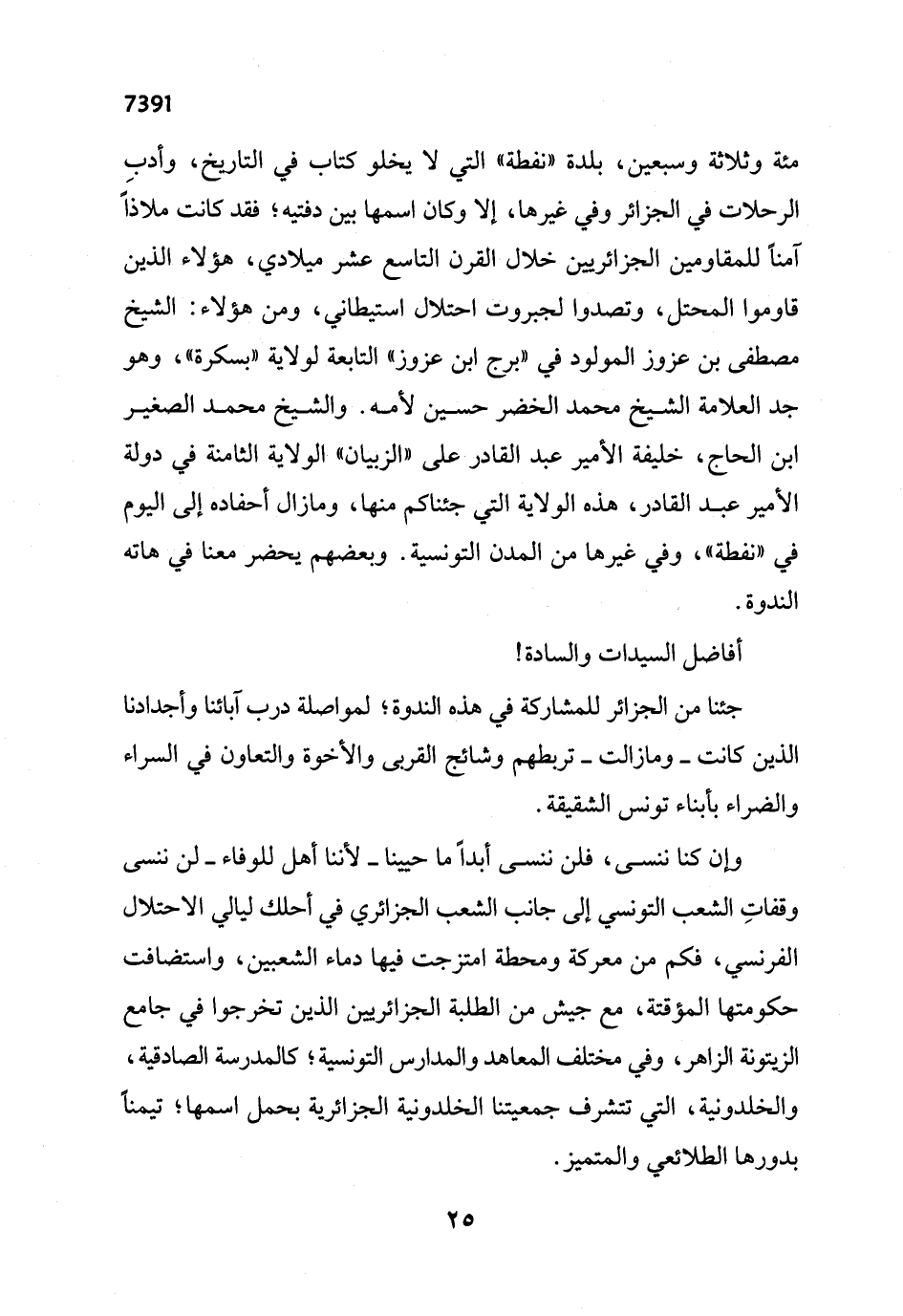 مئة وثلاثة وسبعين، بلدة "نفطة" التي لا يخلو كتاب في التاريخ، وأدبِ الرحلات في الجزائر وفي غيرها، إلا وكان اسمها بين دفتيه؛ فقد كانت ملاذاً آمناً للمقاومين الجزائريين خلال القرن التاسع عشر ميلادي، هؤلاء الذين قاوموا المحتل، وتصدوا لجبروت احتلال استيطاني، ومن هؤلاء: الشيخ مصطفى بن عزوز المولود في "برج ابن عزوز" التابعة لولاية "بسكرة"، وهو جد العلامة الشيخ محمد الخضر حسين لأمه. والشيخ محمد الصغير ابن الحاج، خليفة الأمير عبد القادر على "الزبيان" الولاية الثامنة في دولة الأمير عبد القادر، هذه الولاية التي جئناكم منها، ومازال أحفاده إلى اليوم في "نفطة"، وفي غيرها من المدن التونسية. وبعضهم يحضر معنا في هاته الندوة.