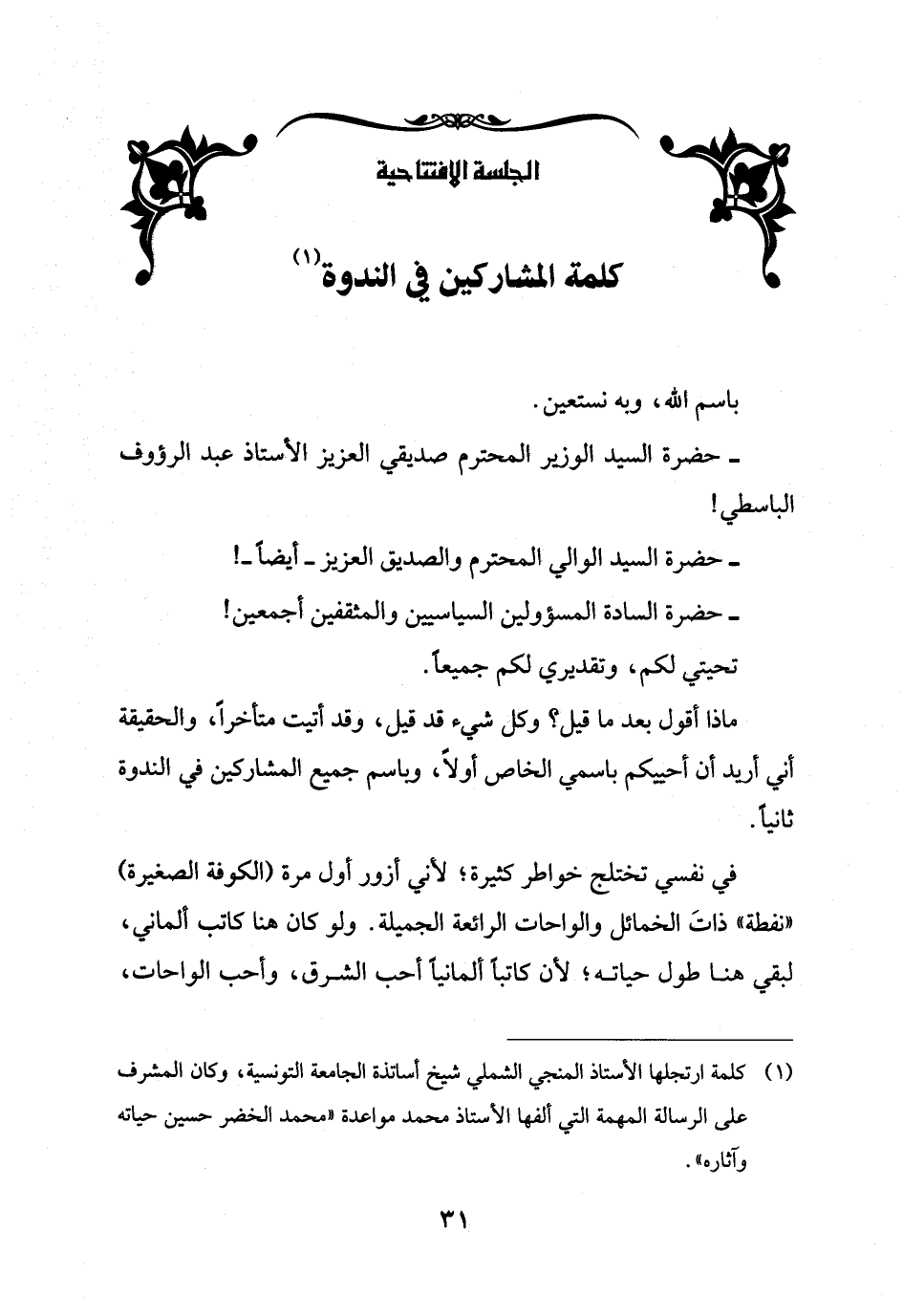 (¬1) كلمة ارتجلها الأستاذ المنجي الشملي شيخ أساتذة الجامعة التونسية، وكان المشرف على الرسالة المهمة التي ألفها الأستاذ محمد مواعدة "محمد الخضر حسين حياته وآثاره".